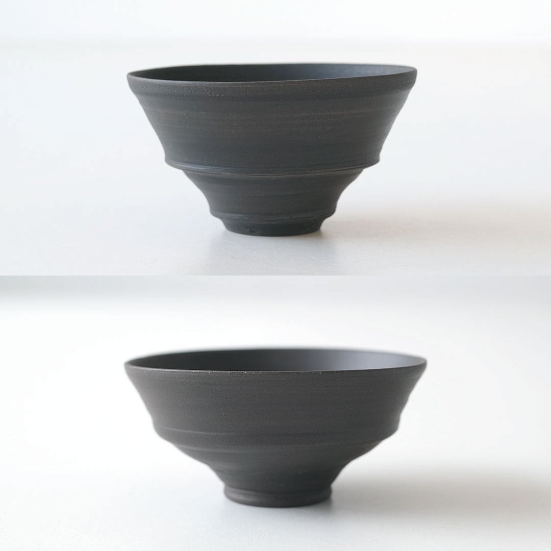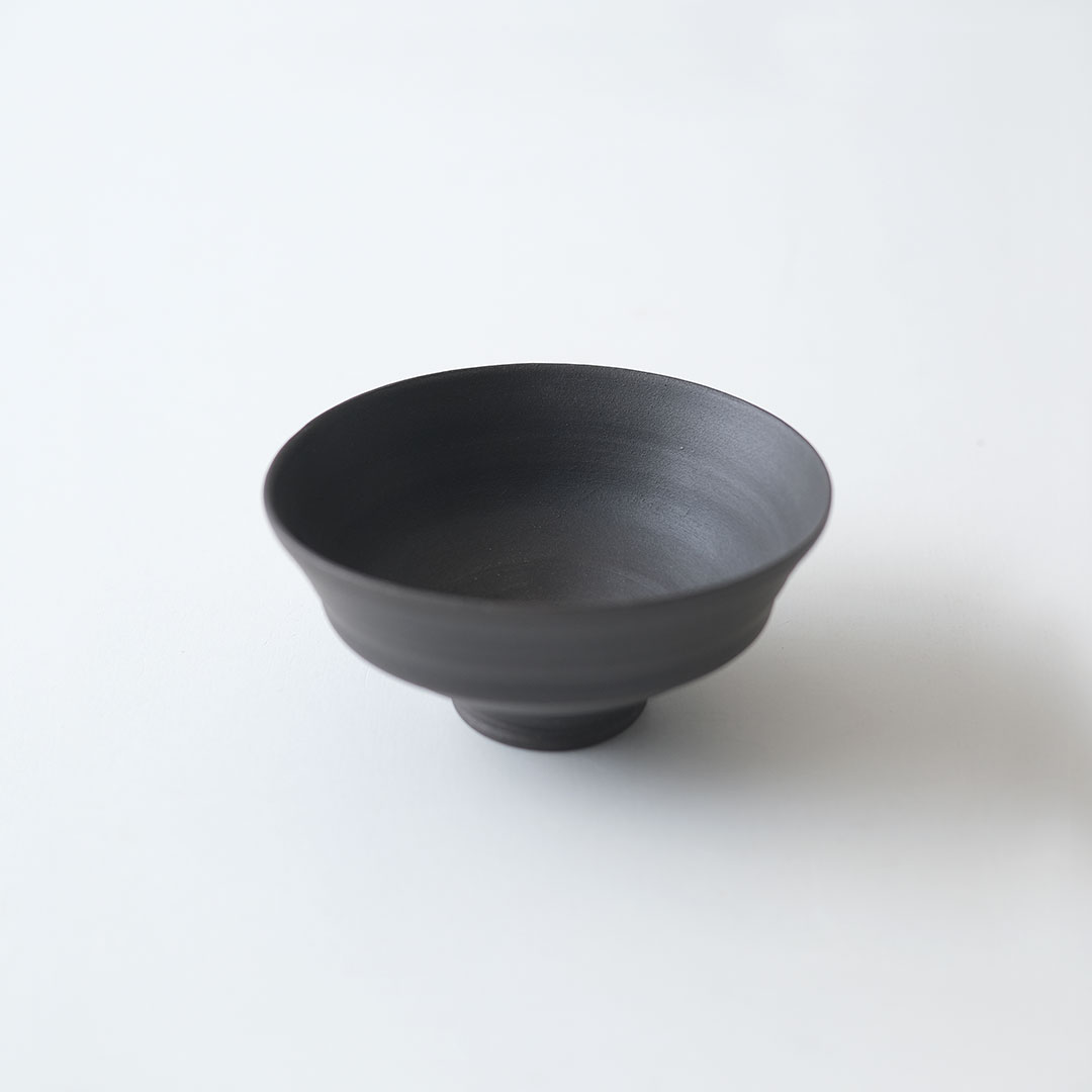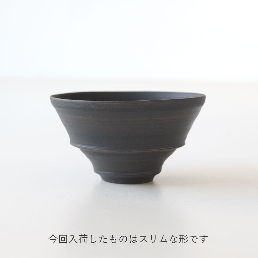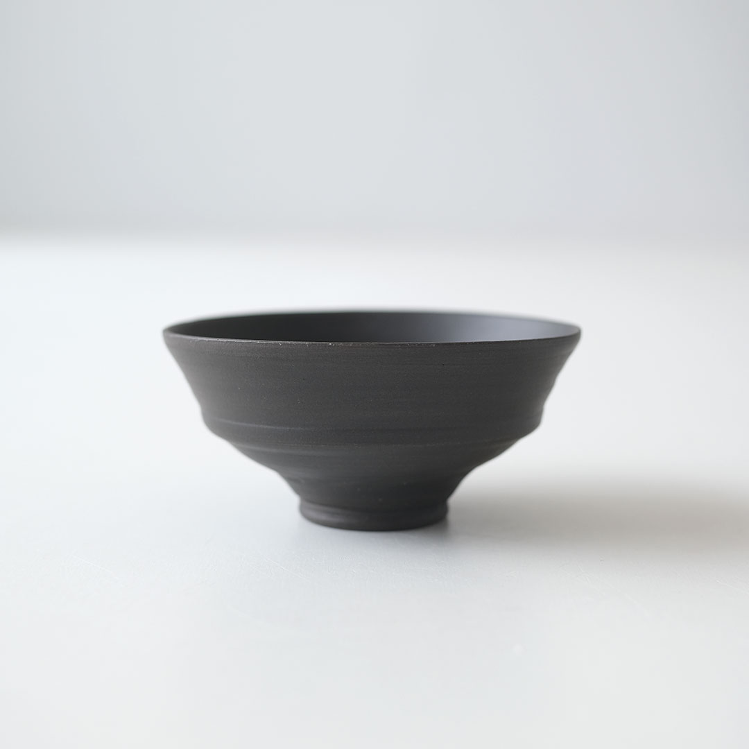 This rice bowl made of black porcelain boasts a striking form with thin, sharp edges and a refined black color.