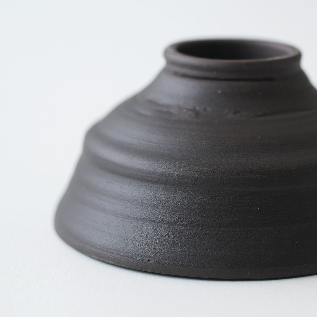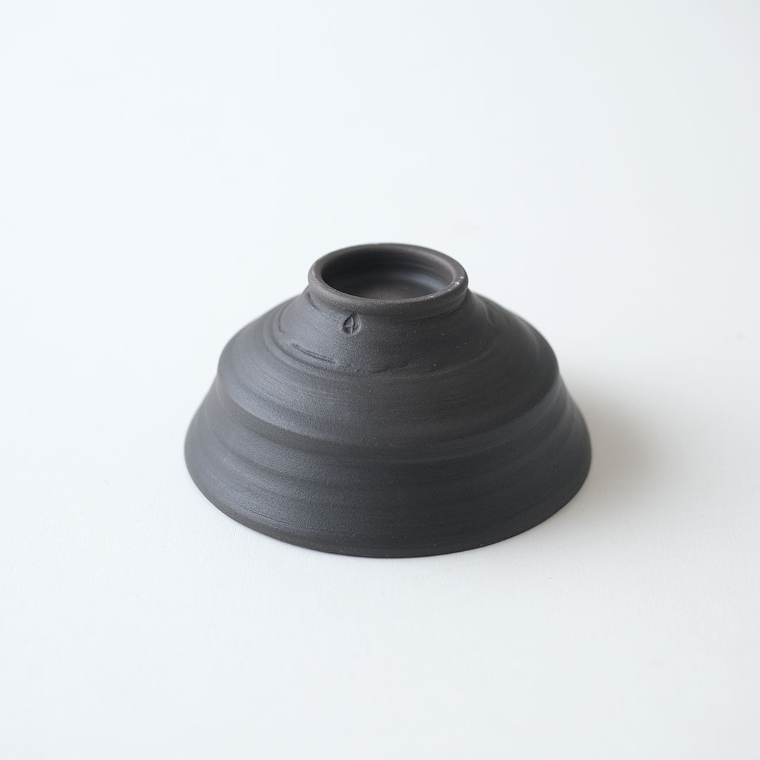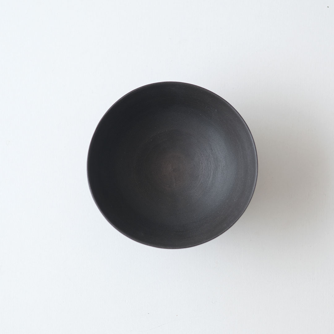 This rice bowl made of black porcelain boasts a striking form with thin, sharp edges and a refined black color.