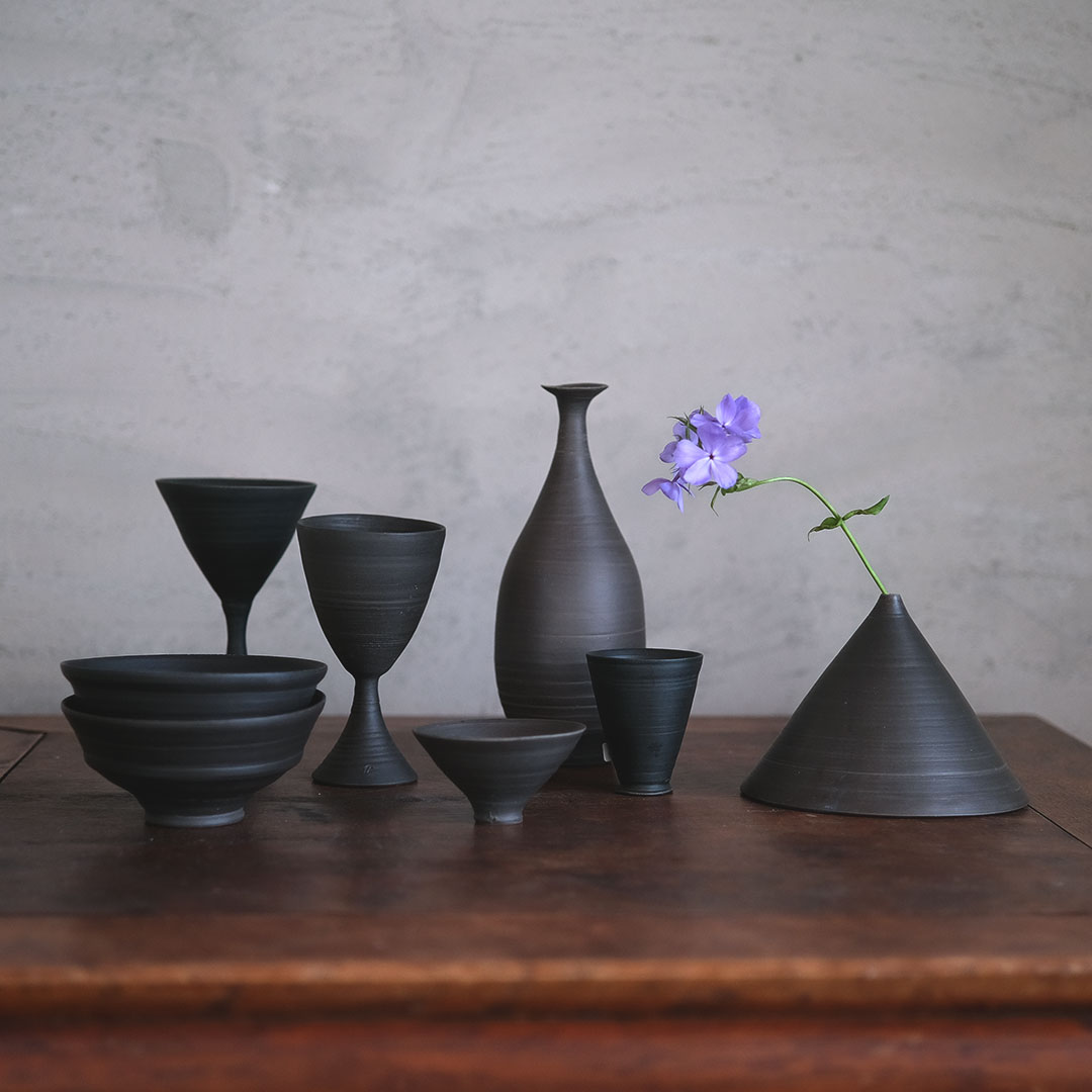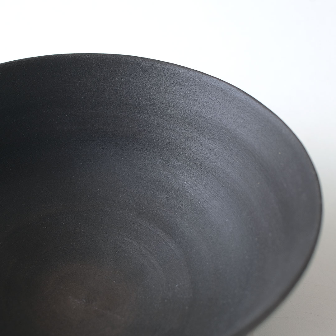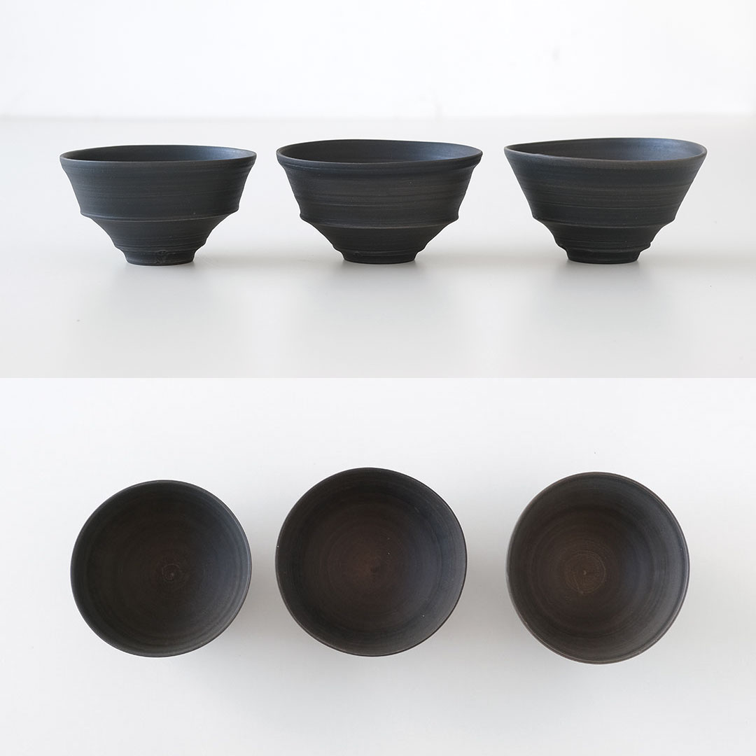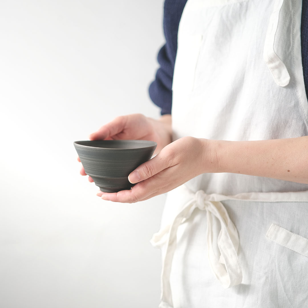 This rice bowl made of black porcelain boasts a striking form with thin, sharp edges and a refined black color.