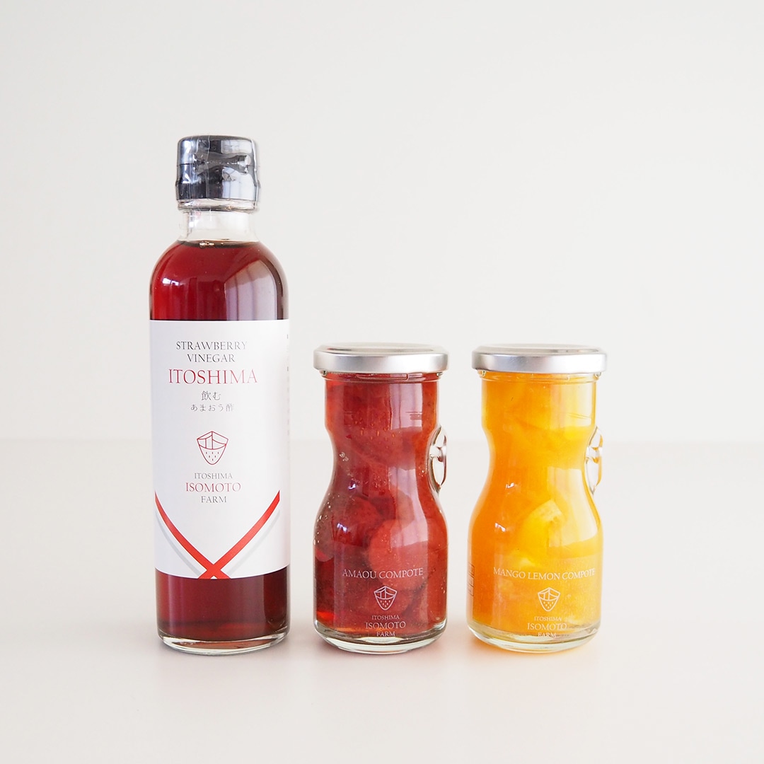 This is a “drinking Amaou vinegar” made from Amaou strawberries harvested at Isomoto Farm in Itoshima.