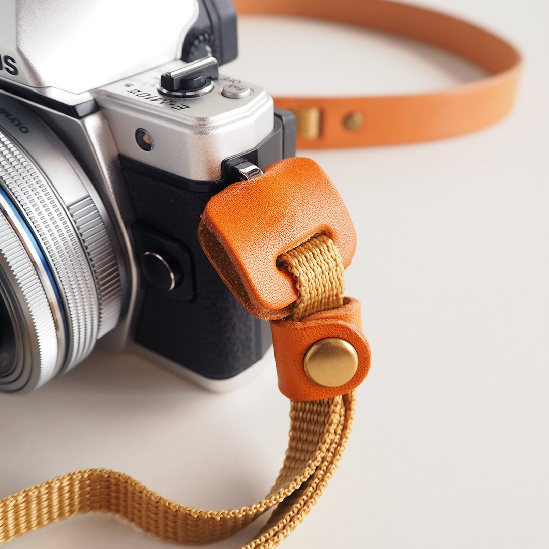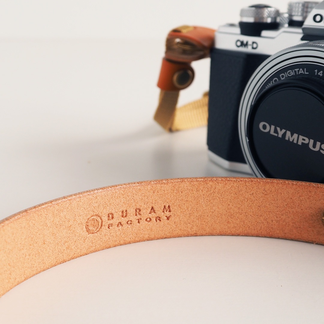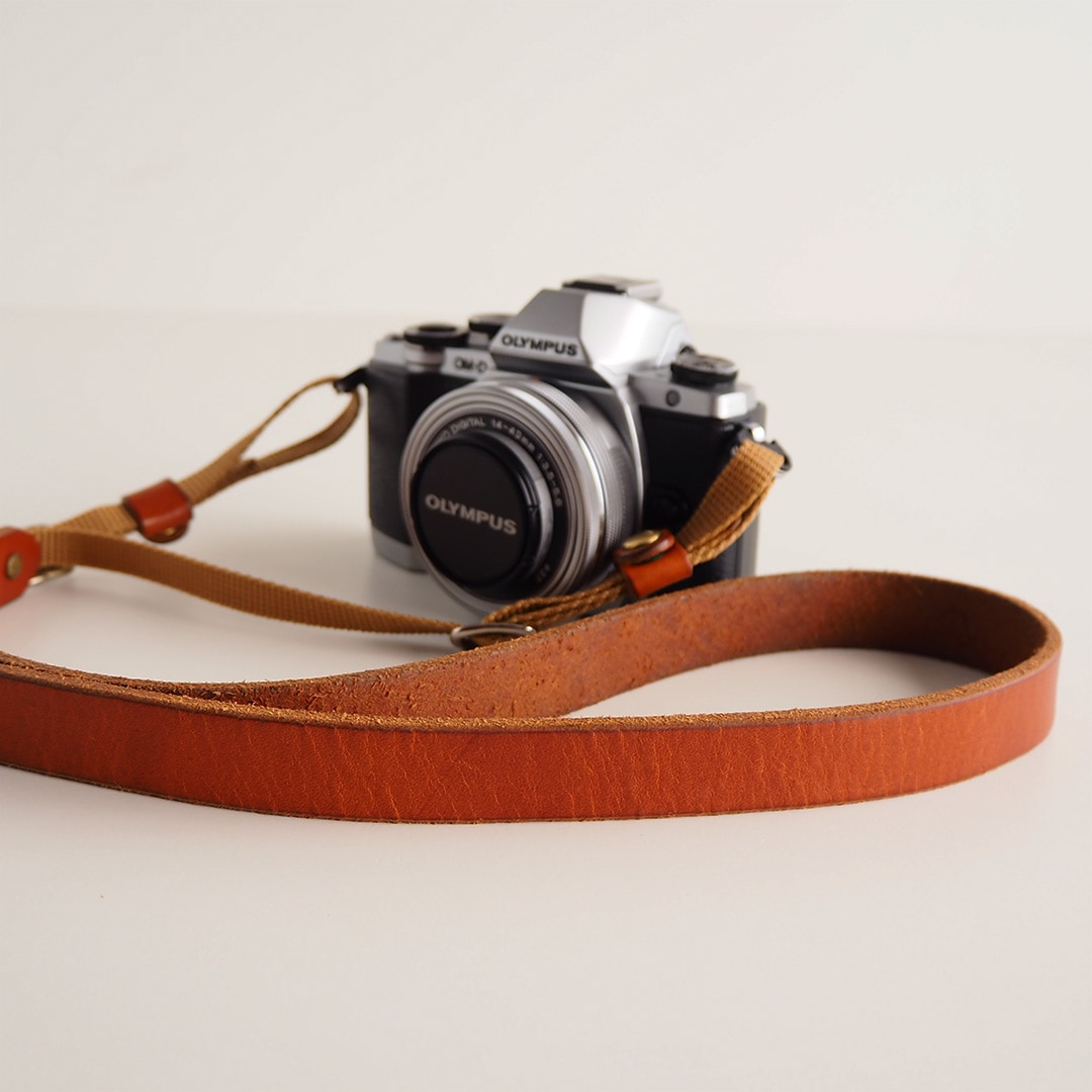This is a camera strap made from thick, oil-rich leather that has a natural look.