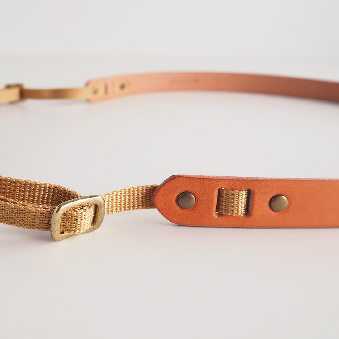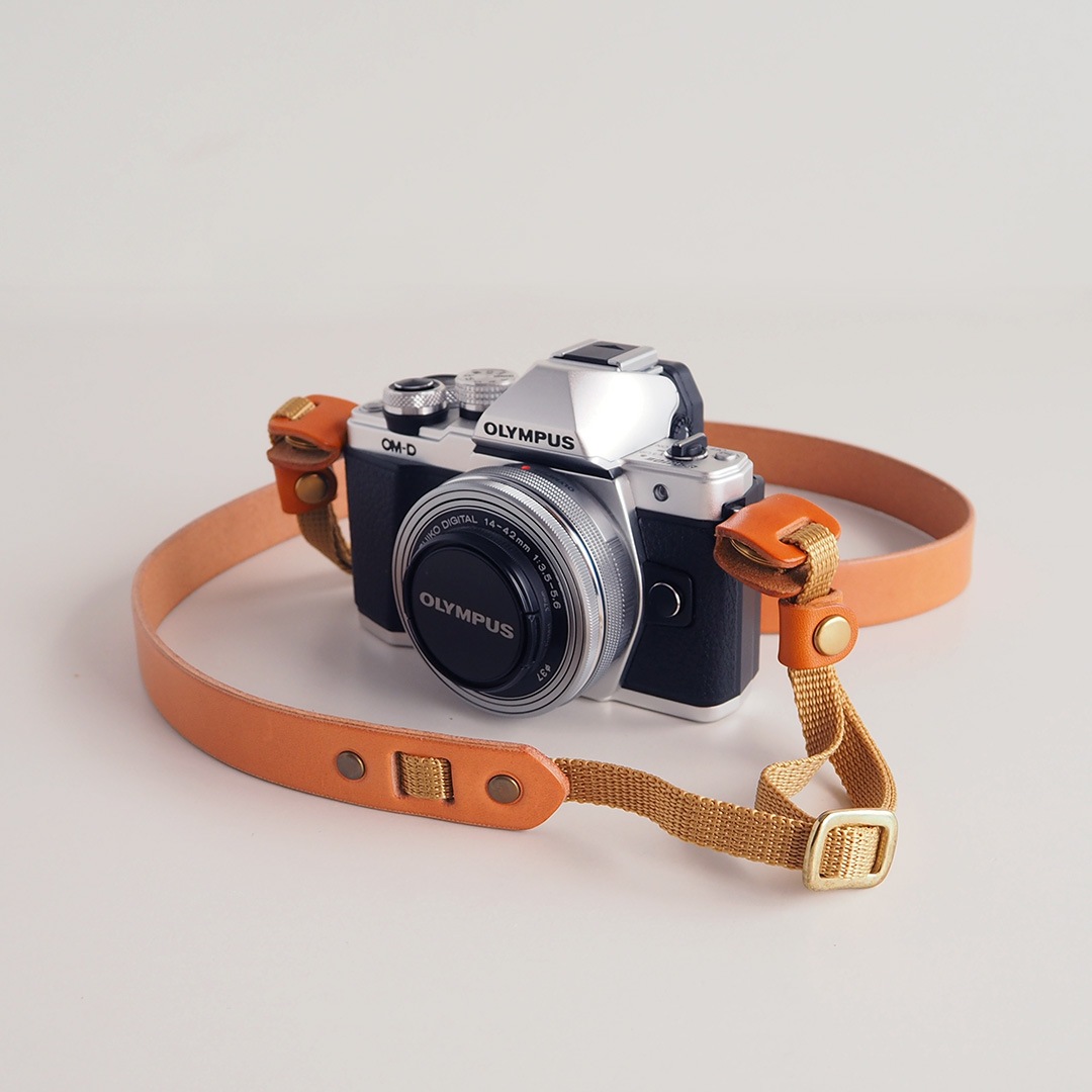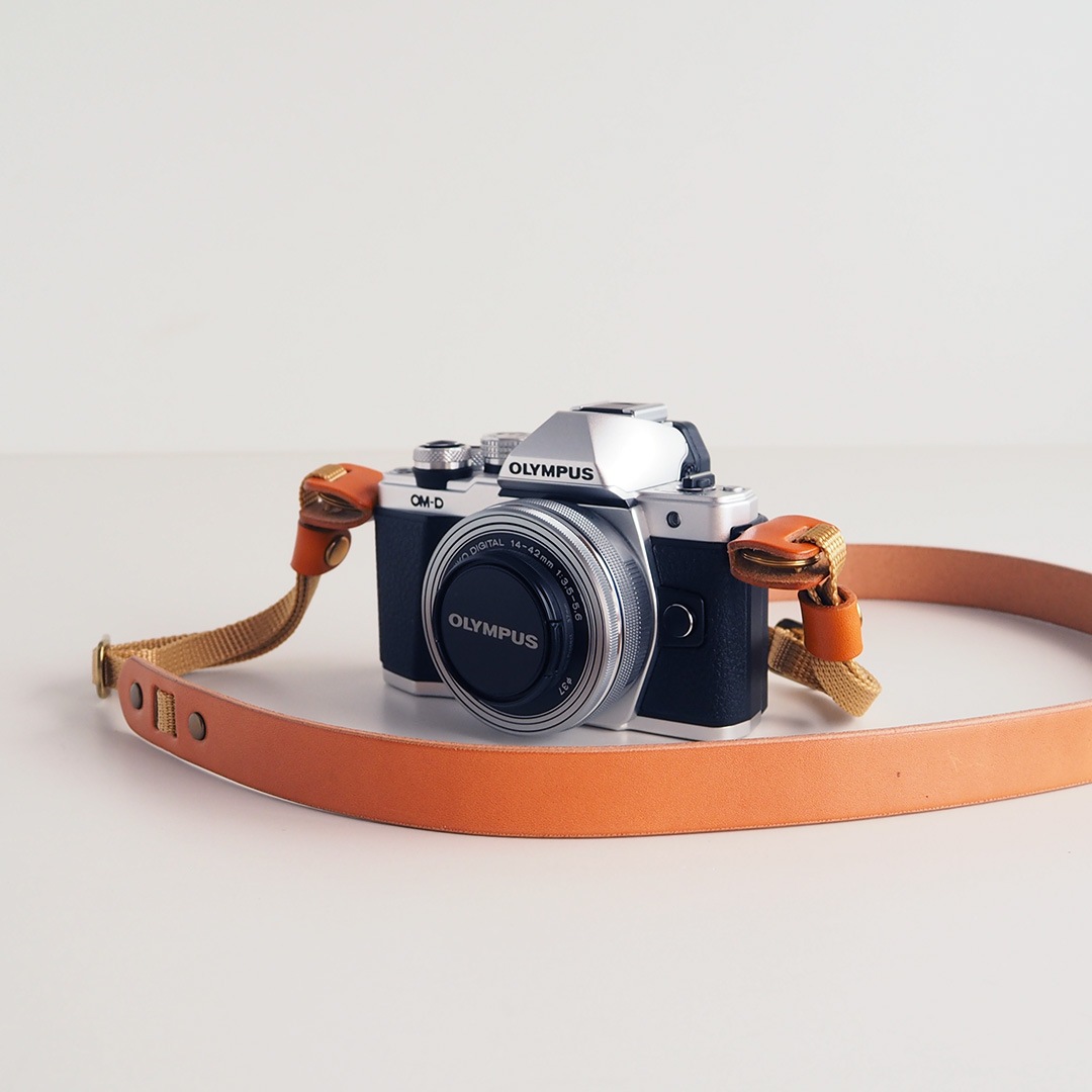 This is a camera strap made from thick, oil-rich leather that has a natural look.