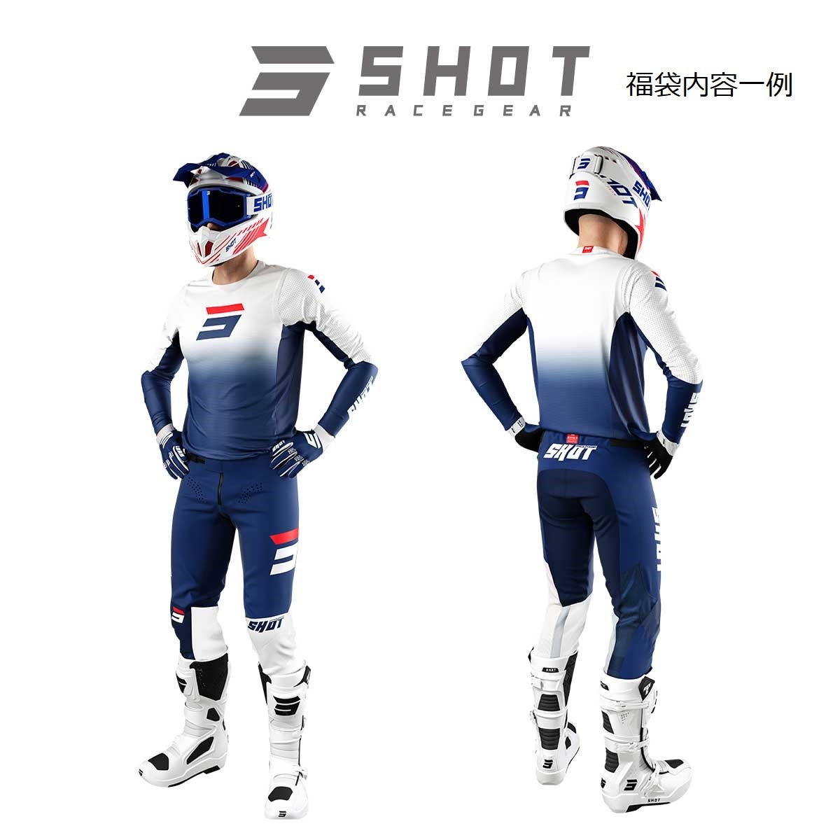 The contents include a set of off-road apparel from 'SHOT RACE GEAR', consisting of a jersey and pants.
