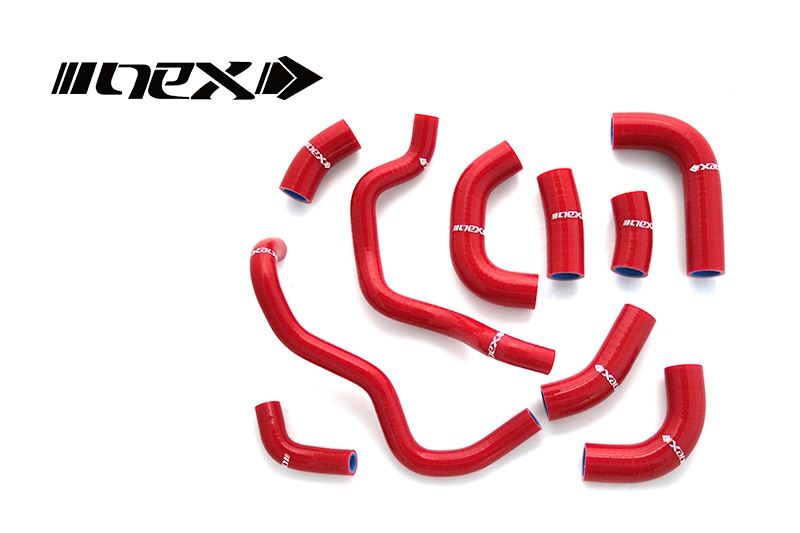 The NEX silicone radiator hose is made from two types of silicone materials. The inner silicone hose improves the flow performance of the coolant, and it is reinforced with a four-layer structure of silicone rubber woven with fiber threads on top. This significantly increases heat resistance and pressure resistance compared to the original hoses, further enhancing engine performance. Designed specifically for each vehicle model, it can be easily installed by replacing the original hose.