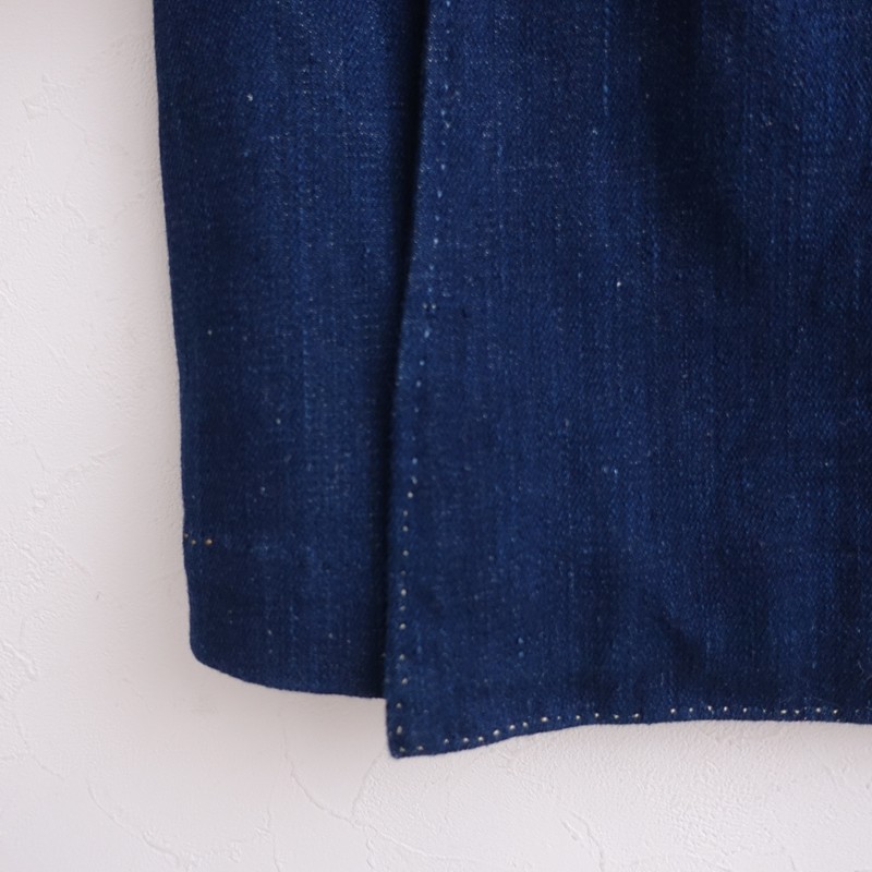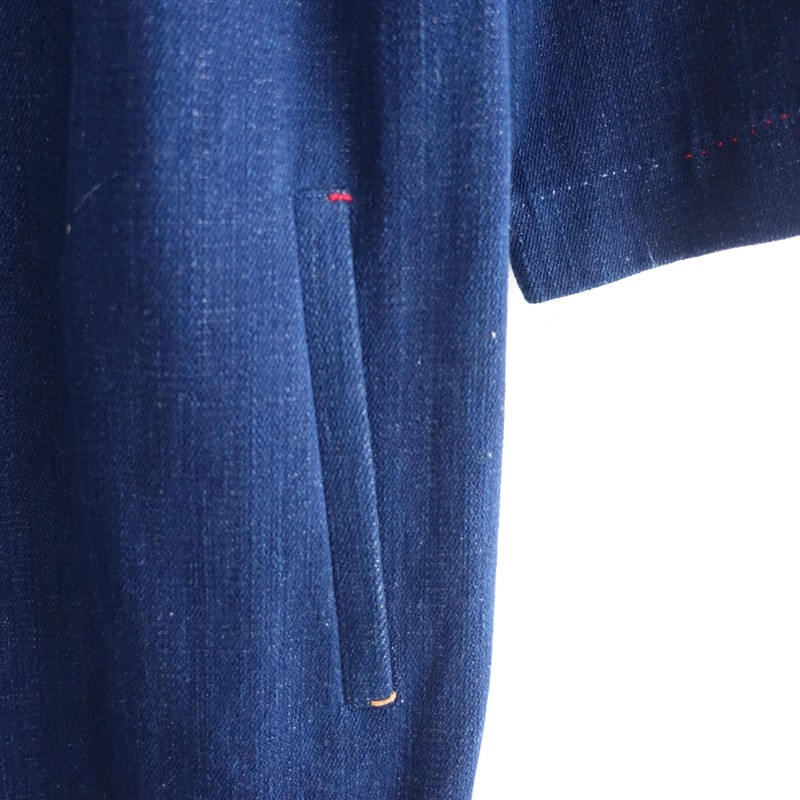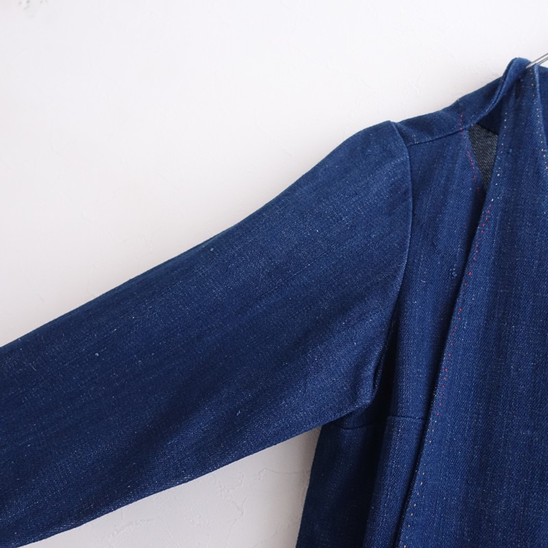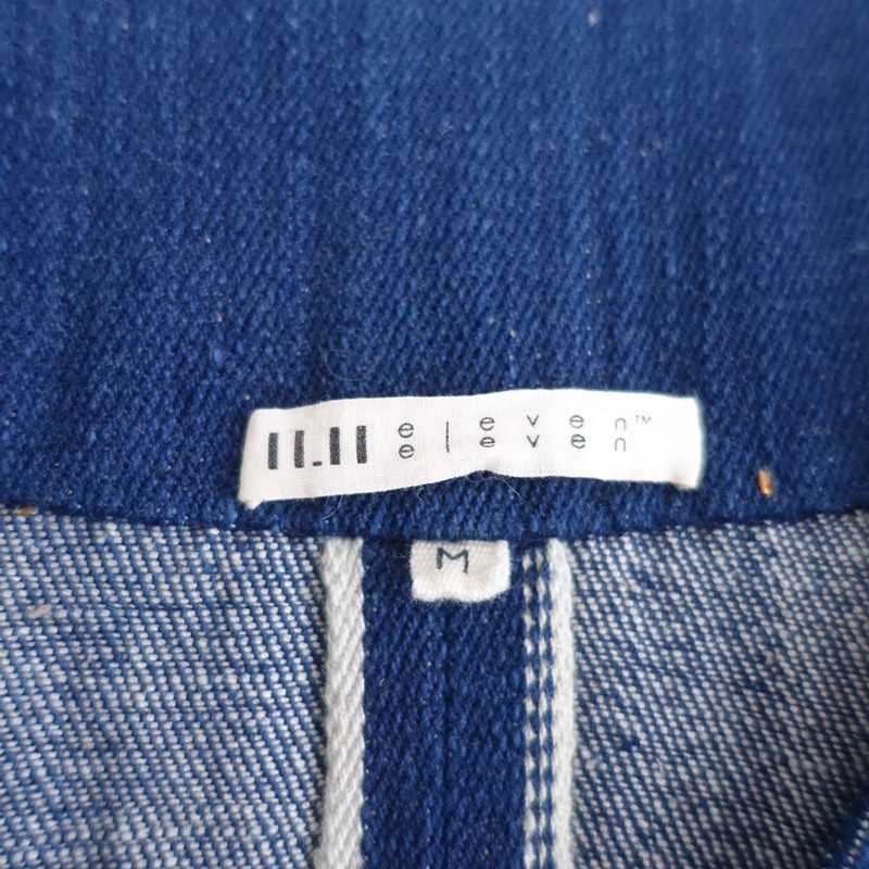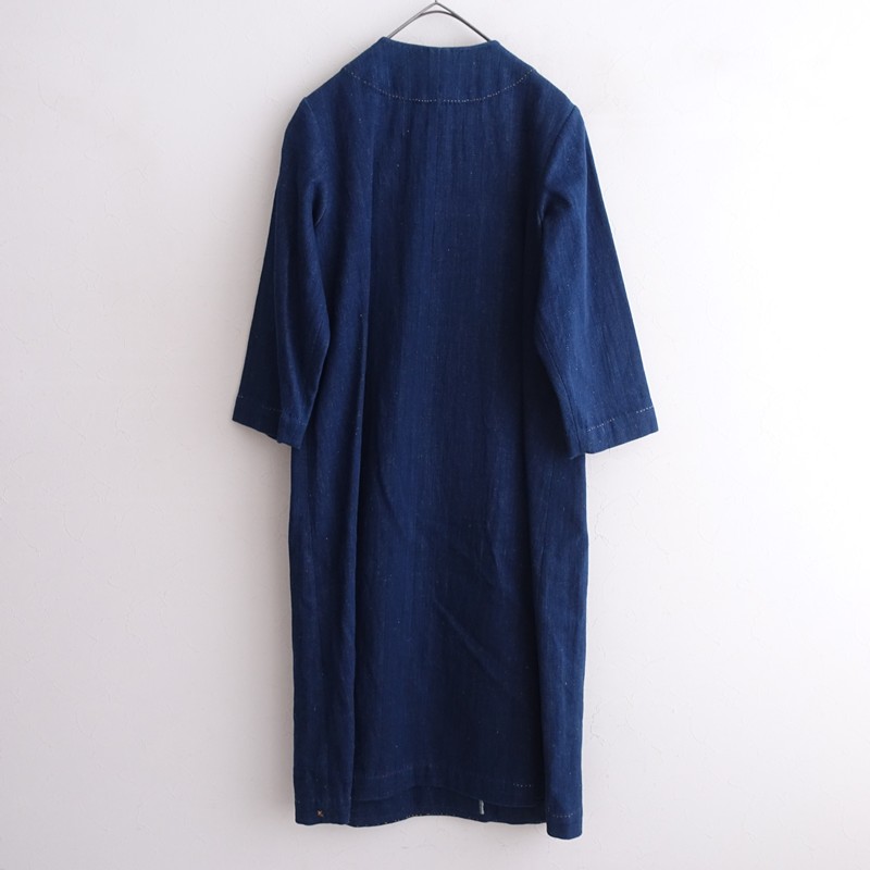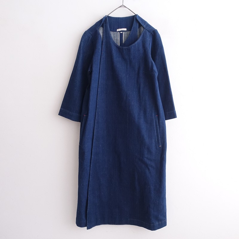**Size**: M **Actual Measurements**: Shoulder Width 39cm, Body Width 54cm, Sleeve Length 46cm, Length 108cm, Waist Width 60cm, Hip Width 62cm (Some discrepancies may occur.) **Material**: 100% Cotton **Color and Details**: This is a denim dress from R45RPM x 11.11. The color is indigo blue, made from cotton denim fabric. The front features a wrap design with side seam pockets. **Condition**: It is used but in clean condition with no noticeable stains or dirt. **SNO.**: 17 **Item Code**: 1-2601-454