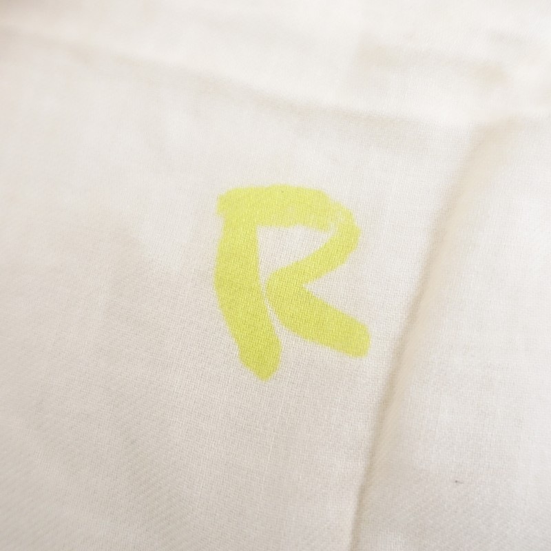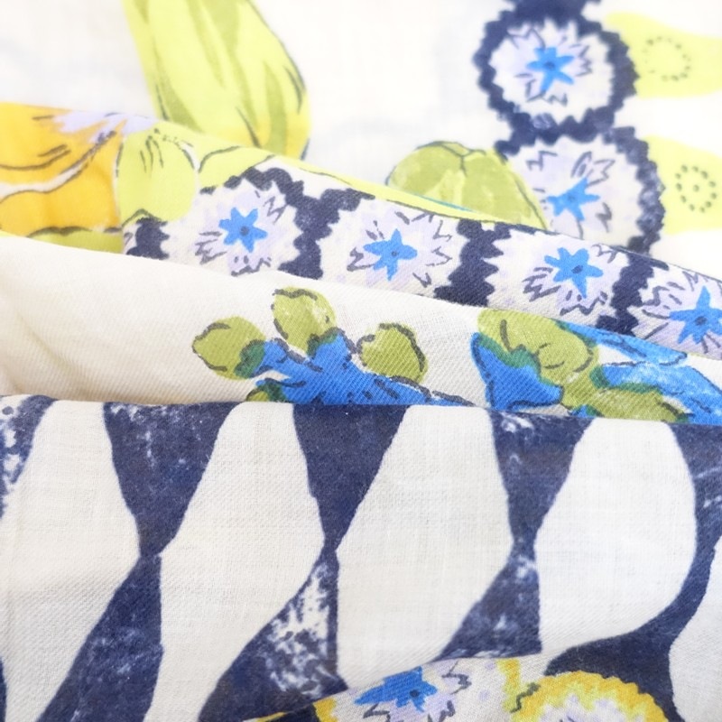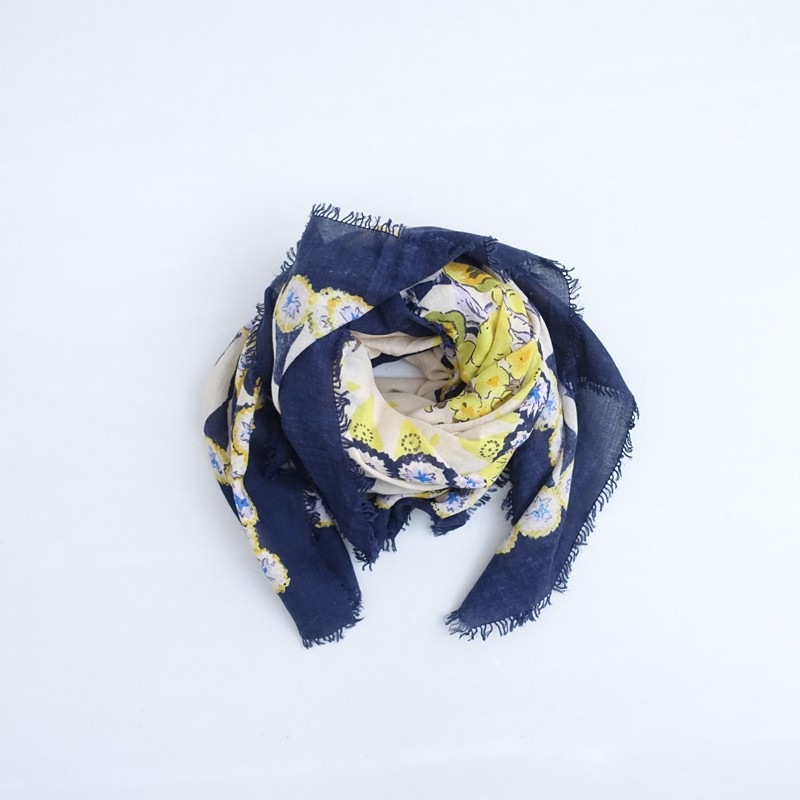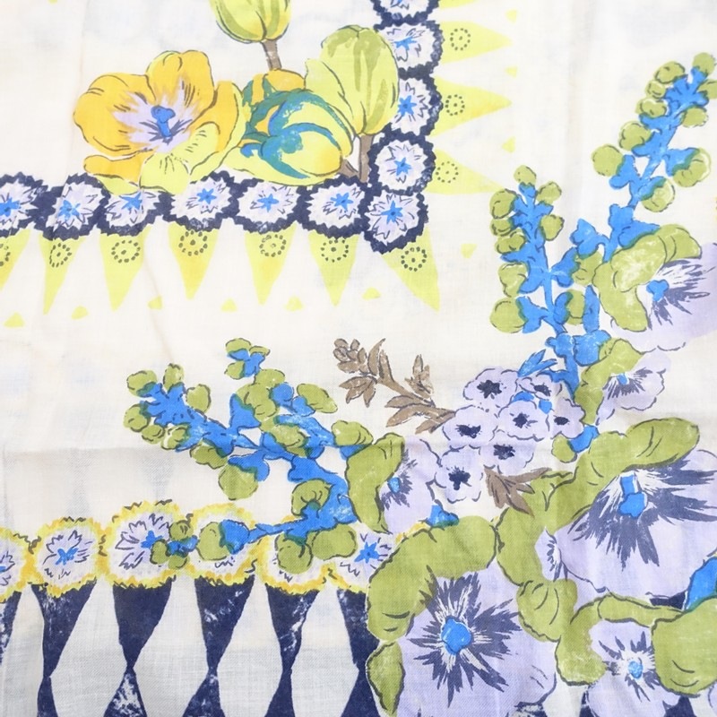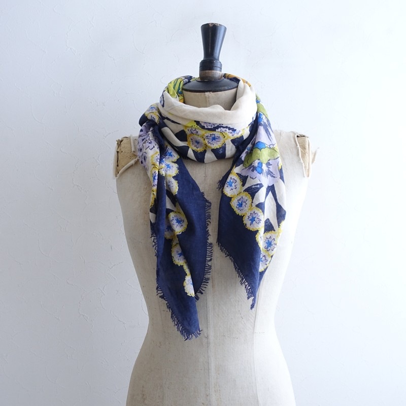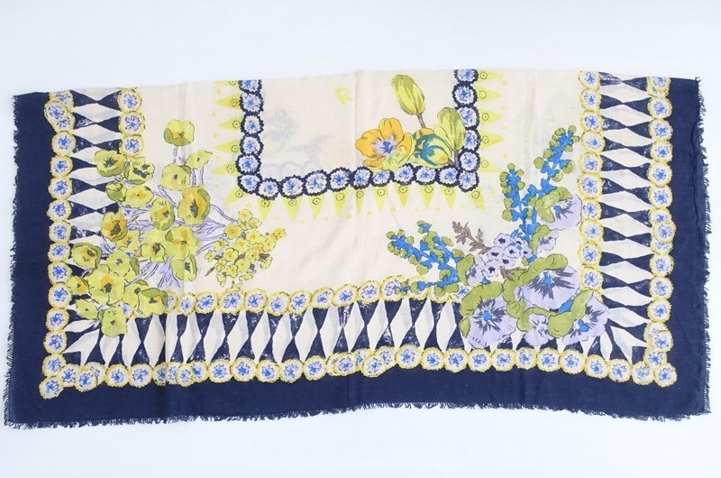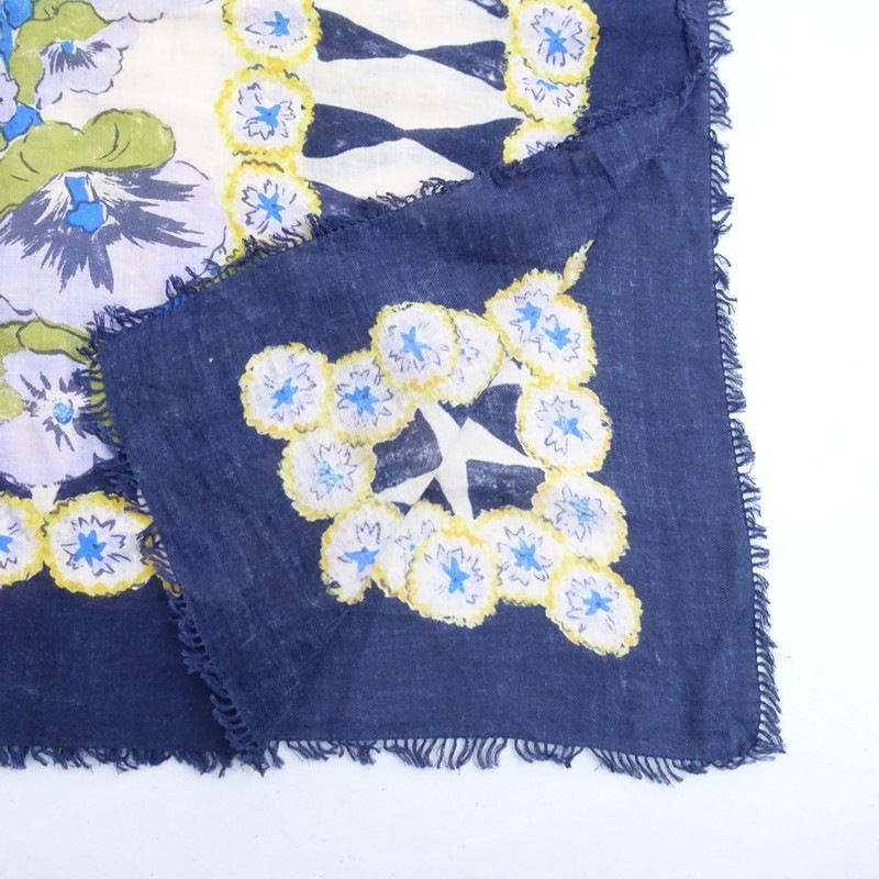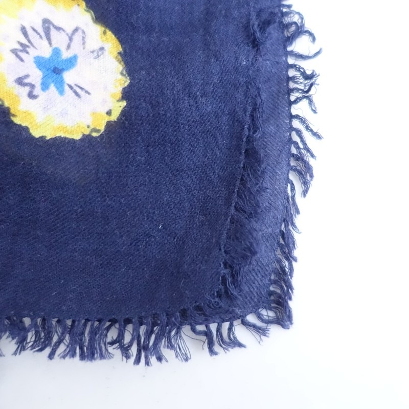 **Actual Size:** 107cm x 110cm, Fringe 1cm (Please allow for slight variations) **Material:** **Color and Design:** This is a large patterned scarf with a floral design from R45RPM. The color scheme includes navy, beige, and yellow in an all-over floral pattern, and it is oversized. The material is soft, and it appears to be cotton, featuring fringes on both sides. **Condition:** It is a used item but is clean and free of stains. st11-2602-35