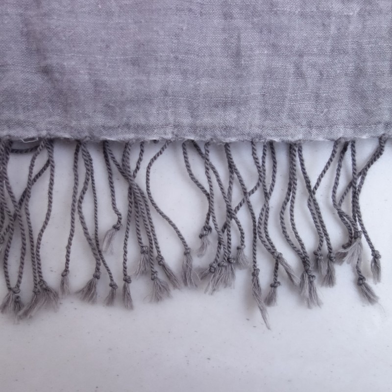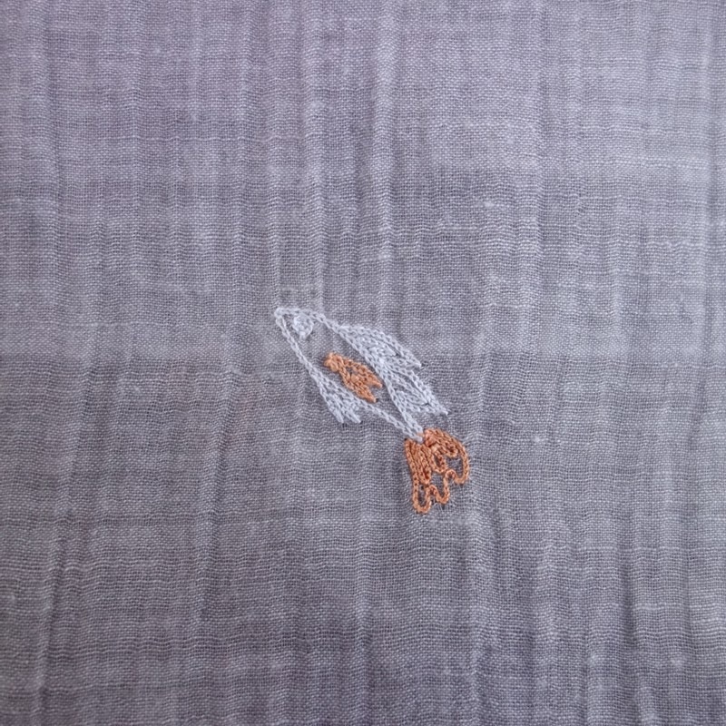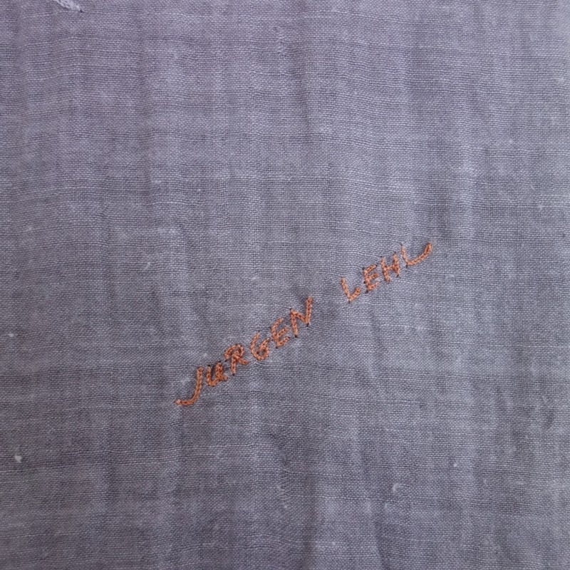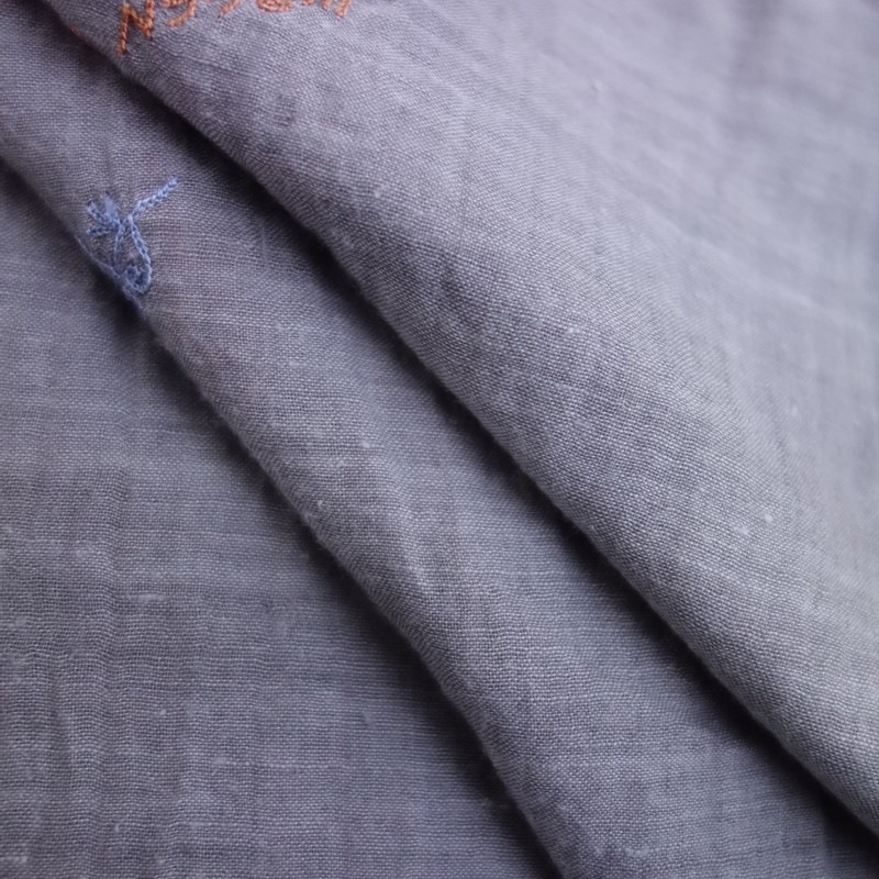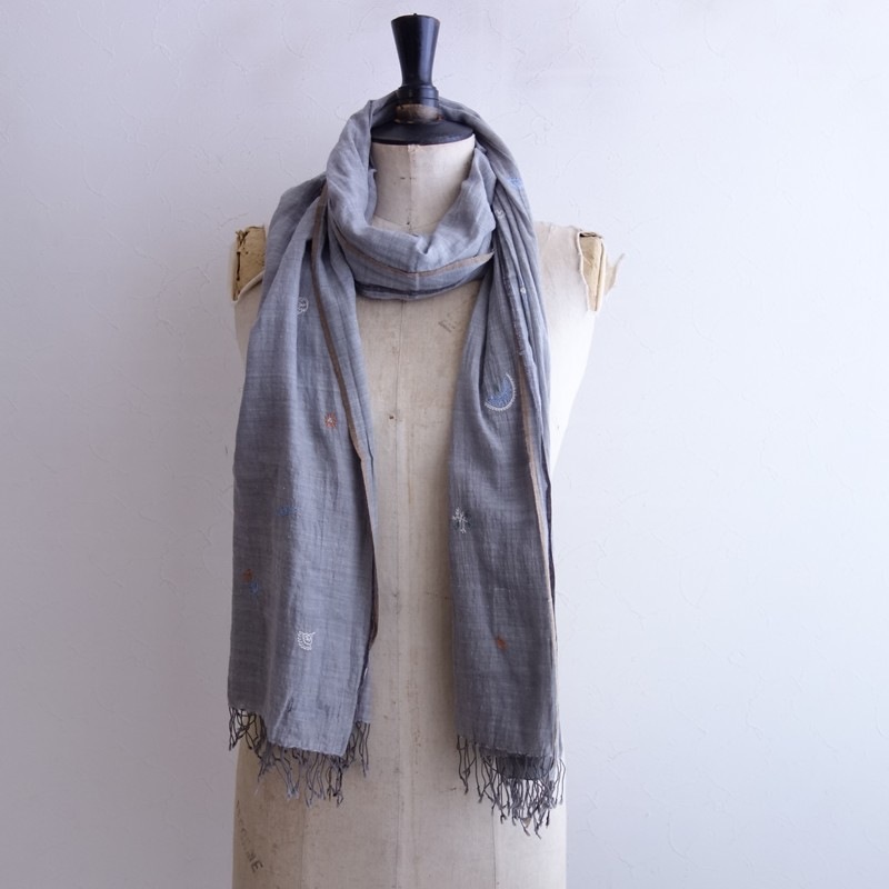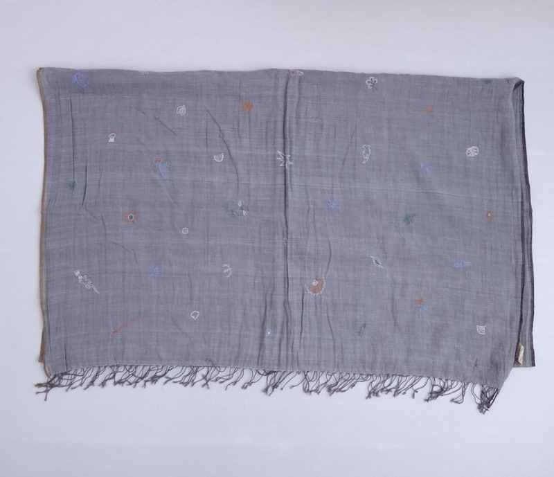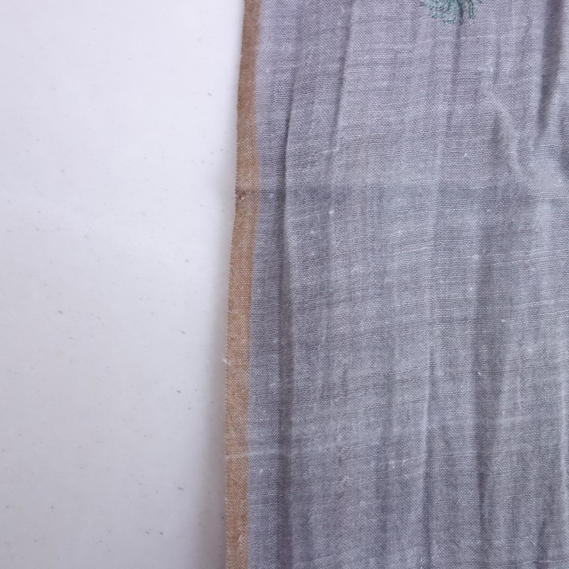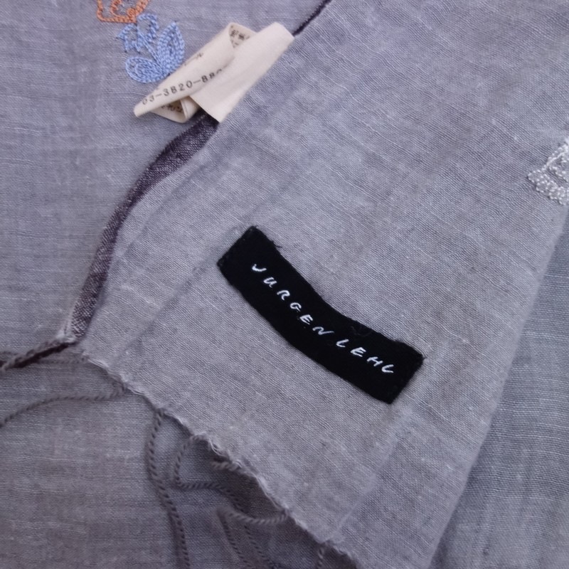 **Actual Size:** 80×205 cm, Fringe approximately 4 cm (Note: There may be slight discrepancies) **Material:** **Color and Details:** This is an embroidered stole by JURGEN LEHL. The color is a light gray cotton fabric, adorned with embroidery in light blue, light brown, and muted green, featuring fringe on both sides. **Condition:** Used, but in clean condition with no noticeable stains or dirt. **st10-2603-3**