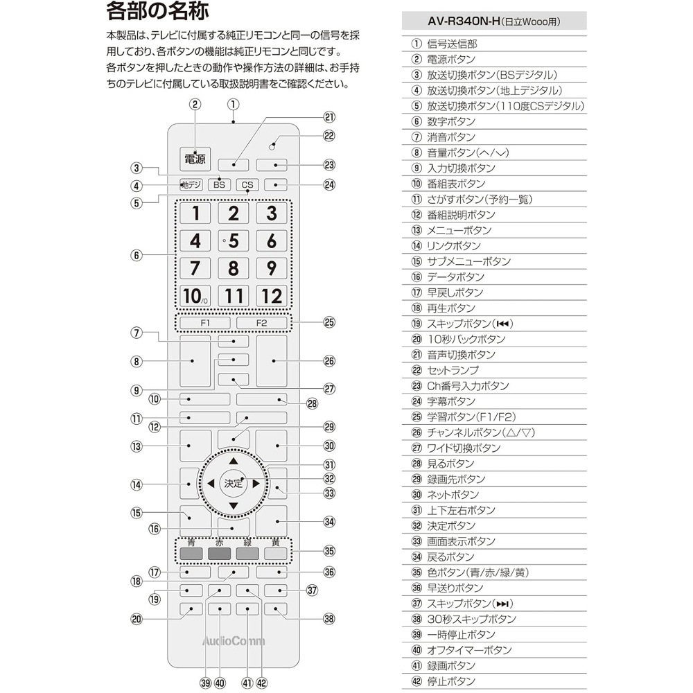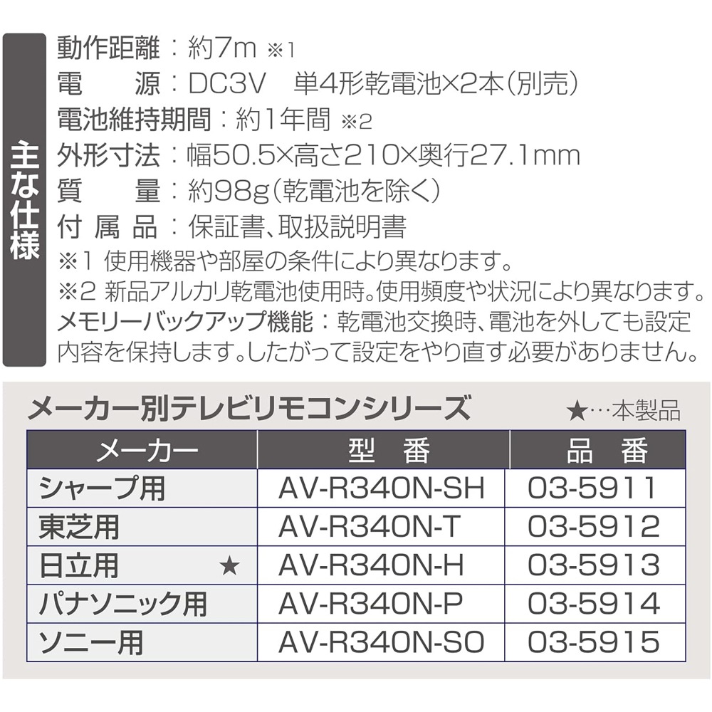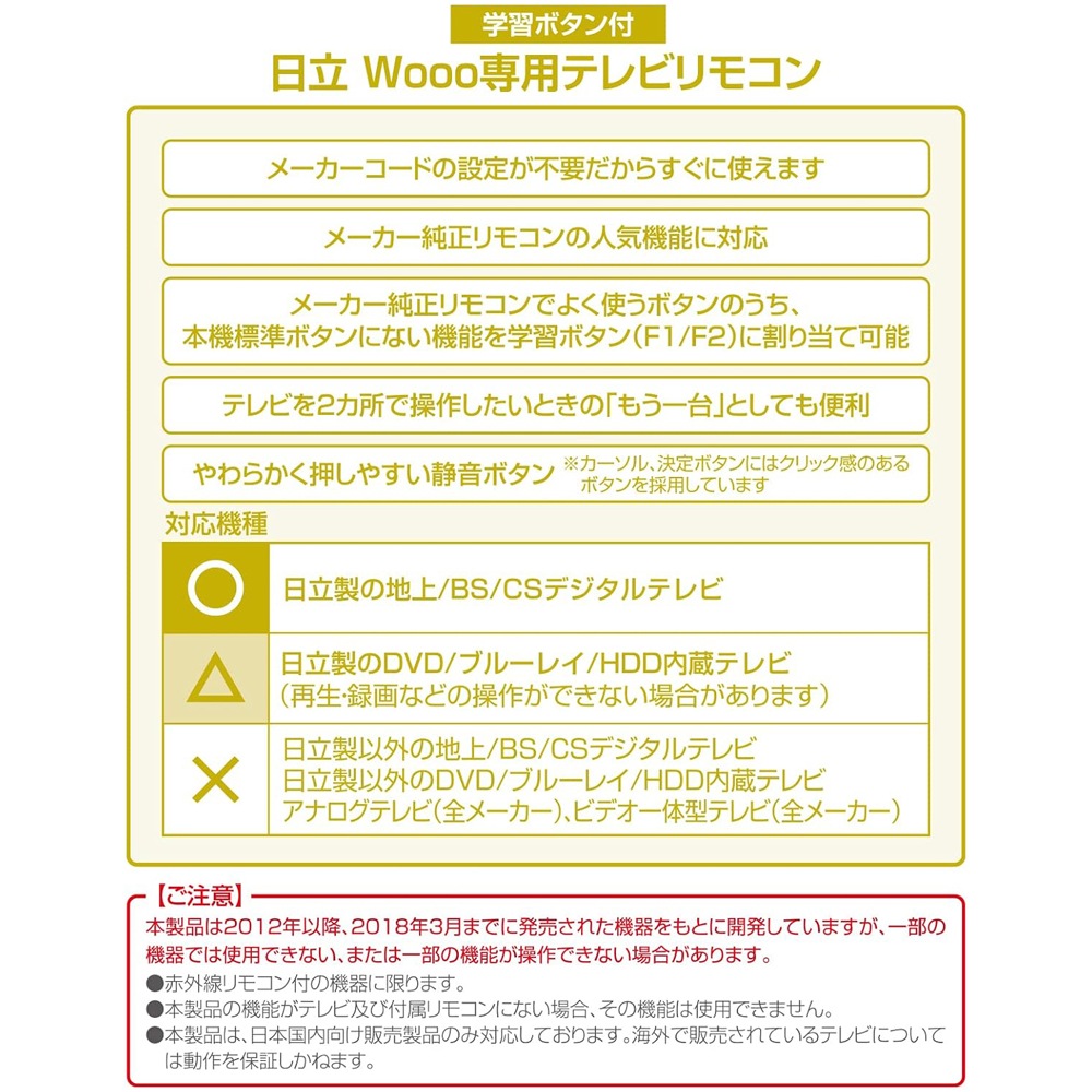 【 Features 】 ● Ready to use immediately and customizable TV remote control exclusive for Hitachi Wooo ● Manufacturer code pre-set, frequently used functions can be registered ● Includes 58 main buttons of the genuine remote + 2 learning registration buttons 【 Specifications 】 ■ Approximate compatible models ○: Hitachi terrestrial/BS/CS digital TVs △: Hitachi DVD/Blu-ray/HDD built-in TVs (may not be able to operate playback/recording, etc.) ×: Non-Hitachi terrestrial/BS/CS digital TVs, non-Hitachi DVD/Blu-ray/HDD built-in TVs, analog TVs (all manufacturers), video integrated TVs (all manufacturers) ■ Operating distance: Approximately 7 meters (varies depending on equipment and room conditions) ■ Power supply: DC 3V, 2 AAA batteries (sold separately) ■ Battery life: Approximately 1 year (when using new alkaline batteries) * Varies depending on frequency of use ■ Dimensions: Width 50.5 × Height 210 × Thickness 27.1 mm ■ Weight: Approximately 98g (excluding batteries) ■ Included accessories: Warranty card, instruction manual ■ Memory backup function: Settings are saved even when batteries are removed during replacement. ≪Caution≫ * This product is developed based on devices released from 2012 to March 2018, some devices may not be usable or some functions may not operate. - Only for devices with infrared remote control. - Functions not present on the TV or attached remote will not be usable with this product. - This product supports only models sold domestically in Japan. Operation on TVs sold overseas is not guaranteed. Applicable models L32-K09, L26-K09, L22-K09, L19-K09, L47-V09, L42-V09, L37-V09, L32-V09, L46-S08, L32-C06, L37-H07(B), L32-H07(B), L26-H07(B), L22-H07(B), L19-H07(B), L32-C05, L32-H05(B)/(W), L26-H05(B)/(W), L22-H05(B)/(W), L19-H05(B)/(W), L32-H03B/W, L26-H03B/W, L22-H03B/W, UT47-XV700, UT42-XV700, UT37-XV700, L42-XV02, L37-XV02, L32-HV02, UT32-HV700B, UT32-HV700W, UT32-HV700A, UT32-HV700R, L37-X01, L32-H01, L26-H01, W32L-H90, W26L-H90, W26L-H80