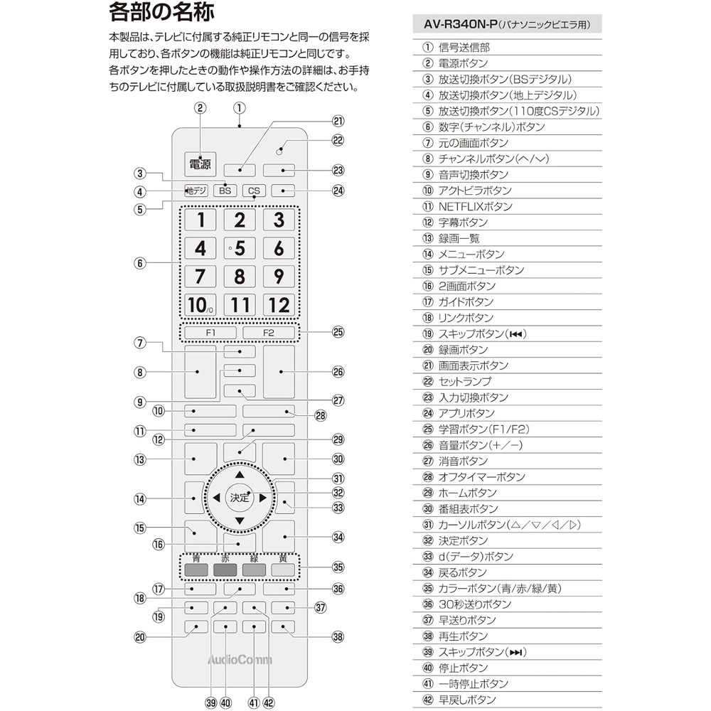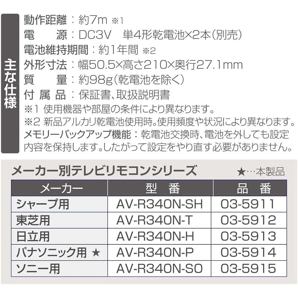 【 Features 】 ● Ready to use immediately and can be customized; dedicated TV remote control for Panasonic VIERA ● Manufacturer code preset; frequently used functions can be registered ● Includes 58 main buttons of the genuine remote + 2 buttons for learning registration 【 Specifications 】 ■ Compatible models guide ○: Panasonic terrestrial/BS/CS digital TVs △: Panasonic DVD/Blu-ray/HDD built-in TVs (operation such as playback or recording may not be possible) ×: Non-Panasonic terrestrial/BS/CS digital TVs, non-Panasonic DVD/Blu-ray/HDD built-in TVs, analog TVs (all manufacturers), TV-VCR combo units (all manufacturers) ■ Operating distance: Approx. 7m (varies depending on devices and room conditions) ■ Power supply: DC 3V, 2 AAA batteries (sold separately) ■ Battery life: Approx. 1 year (when using new alkaline batteries) *Varies with usage frequency ■ Dimensions: Width 50.5 × Height 210 × Depth 27.1 mm ■ Weight: Approx. 98 g (excluding batteries) ■ Accessories: Warranty card, instruction manual ■ Memory backup function: Settings are saved even when batteries are removed during replacement. ≪ Notes ≫ * This product was developed based on devices released from 2012 to March 2018, but it may not be usable with some devices, or some functions may not be operable. - Only for devices equipped with infrared remote control. - Functions not available on the TV or its original remote cannot be used by this product. - This product supports only Japanese domestic models. Operation on TVs sold overseas is not guaranteed. Applicable models include: TH-77EZ1000, TH-65EZ1000, TH-65EZ950, TH-65EX780, TH-60EX850, TH-S60EX850, TH-55EZ950, TH-55EX750, TH-55EX850, TH-S55EX850, TH-55EX600, TH-49EX850, TH-S49EX850, TH-49EX750, TH-49EX600, TH-49E300, TH-43EX750, TH-43EX600, TH-43E300, TH-32ES500, TH-32E300, TH-24ES500, TH-24E300, TH19E300, TH-65DX950, TH-60DX850, TH-S60DX850, TH-58DX950, TH-58DX800, TH-58DX770, TH-55DX850, TH-S55DX850, TH-55DX750, TH-50DX800, TH-50DX770, TH-49DX850, TH-S49DX850, TH-49DX750, TH-49DX600, TH-49D305, TH-49D300, TH-43DX750, TH-43D305, TH-43D300, TH-40DX600, TH-32D325, TH-32D320, TH-32D305, TH-32D300, TH-24D325, TH-24D320, TH-24D305, TH-24D300, TH-19D300, TH-60CX800, TH-S60CX800, TH-60CX800N, TH-55CX800, TH-S55CX800, TH-55CX800N, TH-55CX700, TH-55CS600, TH-50CX700, TH-50C300, TH-50C305, TH-49CX800, TH-S49CX800, TH-49CX800N, TH-49CS650, TH-43CS650, TH-42C300, TH-42C305, TH-40CX700, TH-32C320, TH-32C300, TH-32C325, TH-32C305, TH-24C320, TH-24C300, TH-24C325, TH-24C305, TH-19C300, TH-19C305, TH-85AX900, TH-65AX900, TH-65AX800, TH-58AX800, TH-58AX800F, TH-55AX900, TH-55AX900F, TH-55AX700, TH-55AS800, TH-55AS650, TH-S55AS650, TH-50AX800, TH-50AX800F, TH-50A1SS, TH-50AS630, TH-50A305, TH-50A300, TH-48AX700, TH-47AS800, TH-47AS650, TH-S47AS650, TH-42AS650, TH-S42AS650, TH-42AS600, TH-40AX700, TH-39A305, TH-39A300, TH-32A1SS, TH-32A320, TH-32A305, TH-32A300, TH-24A300, TH-L65WT600, TH-P65VT60, TH-L60FT60, TH-P55VT60, TH-P55GT60, TH-L55FT60, TH-L55DT60, TH-P50GT60, TH-L50E60, TH-L50C65, TH-L50C60, TH-L47FT60, TH-L47DT60, TH-L42FT60, TH-L42DT60, TH-42LDT60, TH-L42E60, TH-L39C60, TH-L32X6, TH-L32C6, TH-L24X6, TH-L24C6, TH-P65ZT5, TH-P60VT5, TH-P60GT5, TH-P55VT5, TH-P55GT5, TH-L55WT5, TH-L55DT5, TH-L55ET5, TH-P55VT55, TH-P50VT5, TH-P50GT5, TH-P50ZT5, TH-P50VT55, TH-L47WT5, TH-L47DT5, TH-L47ET5, TH-P42GT5, TH-L42DT5, TH-L42ET5, TH-L42E5, TH-P42GT55, TH-L37ET5, TH-L37C5, TH-L32ET5, TH-L32X50, TH-L32X5, TH-L32C50, TH-L32C5, TH-L26C5, TH-L23X50, TH-L23X5, TH-L23C5, TH-L19X50, TH-L19X5, TH-L19C50, TH-L19C5, TH-L19CF5