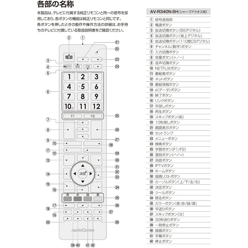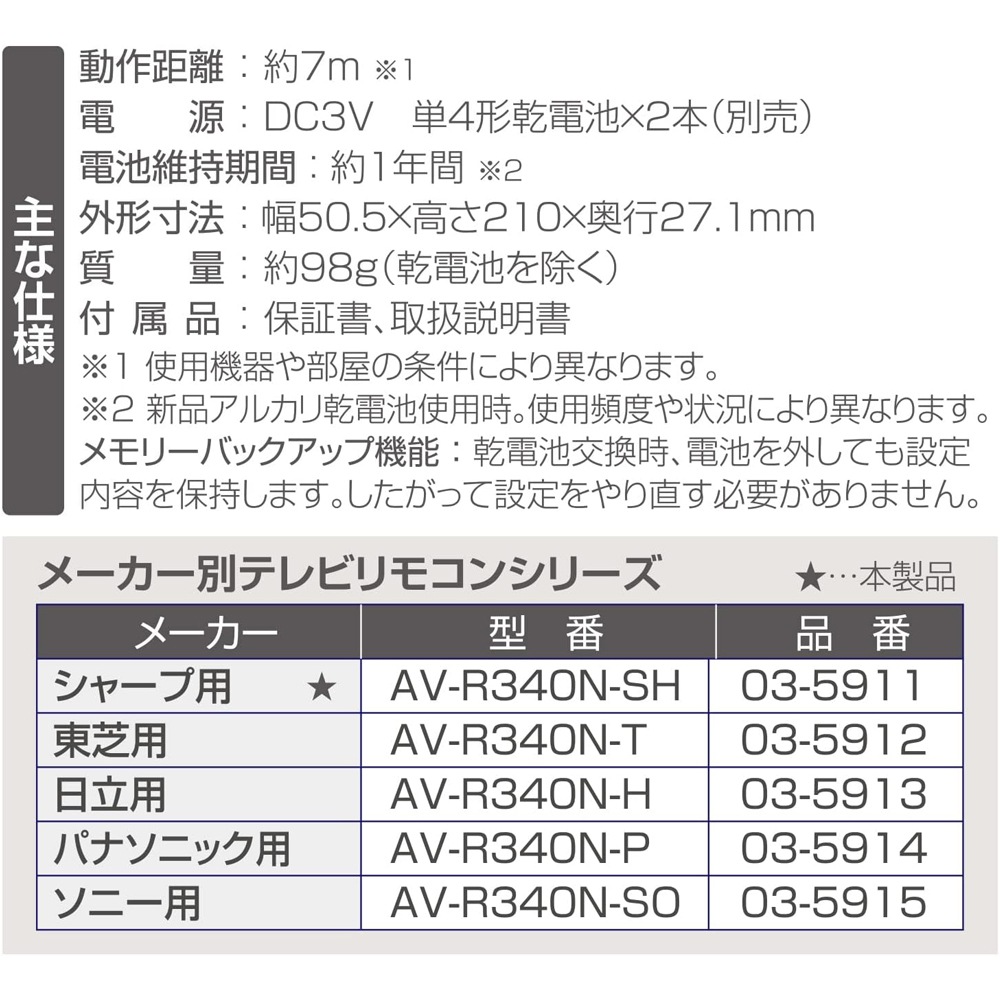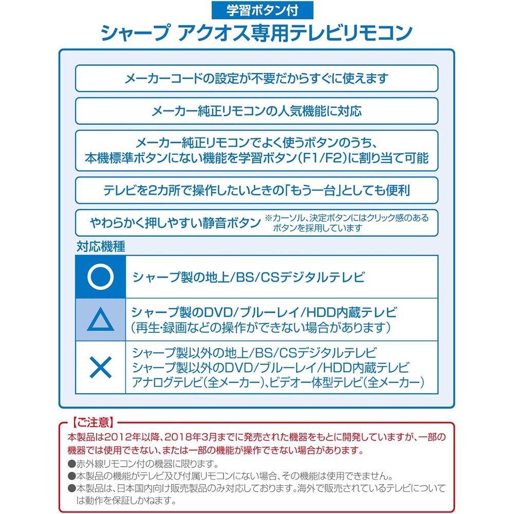 【 Features 】 ● Pre-set with manufacturer codes for immediate use ● Allows customization by registering frequently used functions ● Equipped with the major 58 buttons of the genuine remote control + 2 buttons for learning registration 【 Specifications 】 ■ Compatible models guideline ○: Sharp terrestrial / BS / CS digital TVs △: Sharp DVD / Blu-ray / HDD built-in TVs (may not support playback, recording, etc.) ×: Non-Sharp terrestrial / BS / CS digital TVs, non-Sharp DVD / Blu-ray / HDD built-in TVs, analog TVs (all manufacturers), video-integrated TVs (all manufacturers) ■ Operating distance: Approximately 7 meters (may vary depending on device and room conditions) ■ Power supply: DC 3V, 2 AAA batteries (sold separately) ■ Battery life: Approximately 1 year (when using new alkaline batteries) ※ varies with usage frequency ■ Dimensions: Width 50.5 × Height 210 × Thickness 27.1 mm ■ Weight: Approximately 98g (excluding batteries) ■ Included accessories: Warranty card, instruction manual ■ Memory backup function: Saves settings even when batteries are removed during replacement ≪Notes≫ ※ This product was developed based on devices released between 2012 and March 2018. However, it may not work with some devices or some functions may be inoperable. ・ Only for devices with infrared remote control ・ If the function is not available on the TV or its original remote, it cannot be used with this product ・ This product is only compatible with models sold in Japan. Operation is not guaranteed for TVs sold overseas. Compatible Models LC-80GL7, LC-80GL7, LC-80XL9, LC-80XL10, LC-80XU30, LC-70GL7, LC-70Q7, LC-70UD1, LC-70UD20, LC-70US4, LC-70XG35, LC-70XL10, LC-70XL9, LC-60G7, LC-60G9, LC-60U45, LC-60UD1, LC-60UD20, LC-60UH5, LC-60US5, LC-60US20, LC-60US30, LC-60US40, LC-60US45, LC-60W7, LC-60XD35, LC-60XL9, LC-60XL10, LC-60XL20, LC-60Z9, LC-58U30, LC-55U30, LC-55U40, LC-55U45, LC-55UH5, LC-55US5, LC-55US40, LC-55US45, LC-55W30, LC-55W35, LC-55XD45, LC-52F5, LC-52G7, LC-52G9, LC-52UD20, LC-52US20, LC-52US30, LC-52W9, LC-52W10, LC-52XL9, LC-52XL10, LC-52XL20, LC-50U20, LC-50U30, LC-50U40, LC-50U45, LC-50US5, LC-50US40, LC-50US45, LC-50W20, LC-50W30, LC-50W35, LC-46F5, LC-46G7, LC-46G9, LC-46V7, LC-46W9, LC-46W10, LC-46XL9, LC-46XL10, LC-46XL20, LC-45US40, LC-45US45, LC-45W5, LC-40BH11, LC-40BH30, LC-40DR9, LC-40E40, LC-40G7, LC-40G9, LC-40H7, LC-40H9, LC-40H11, LC-40H20, LC-40H30, LC-40H40, LC-40HW10, LC-40HW20, LC-40J9, LC-40J10, LC-40R30, LC-40S5, LC-40U20, LC-40U30, LC-40U40, LC-40U45, LC-40V7, LC-40W5, LC-40W20, LC-40W35, LC-32BH11, LC-32BH30, LC-32BH35, LC-32DR9, LC-32E40, LC-32H7, LC-32H9, LC-32H10, LC-32H11, LC-32H20, LC-32H30, LC-32H40, LC-32J9, LC-32J10, LC-32R30, LC-32S5, LC-32SW25, LC-32V7, LC-32W5, LC-32W25, LC-32W35, LC-26V7, LC-24BK20, LC-24BK40, LC-24K7, LC-24K9, LC-24K20, LC-24K30, LC-24K40, LC-24MX1, LC-24P5, LC-24R30, LC-22K7, LC-22K9, LC-22K20, LC-22K30, LC-22K40, LC-22K45, LC-22K90, LC-19K7, LC-19K20, LC-19K30, LC-19K40, LC-19K90, LC-19P5