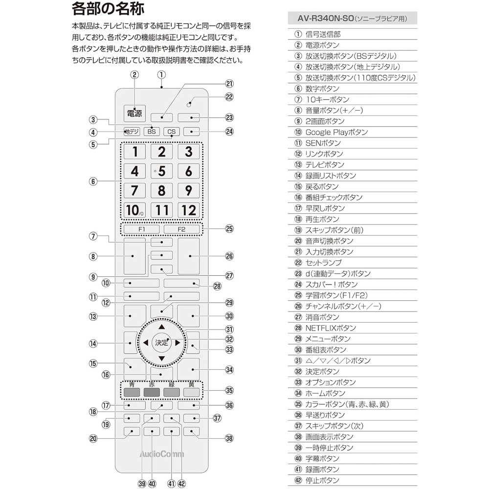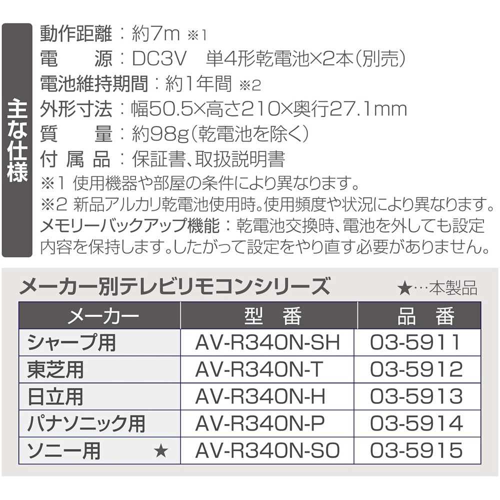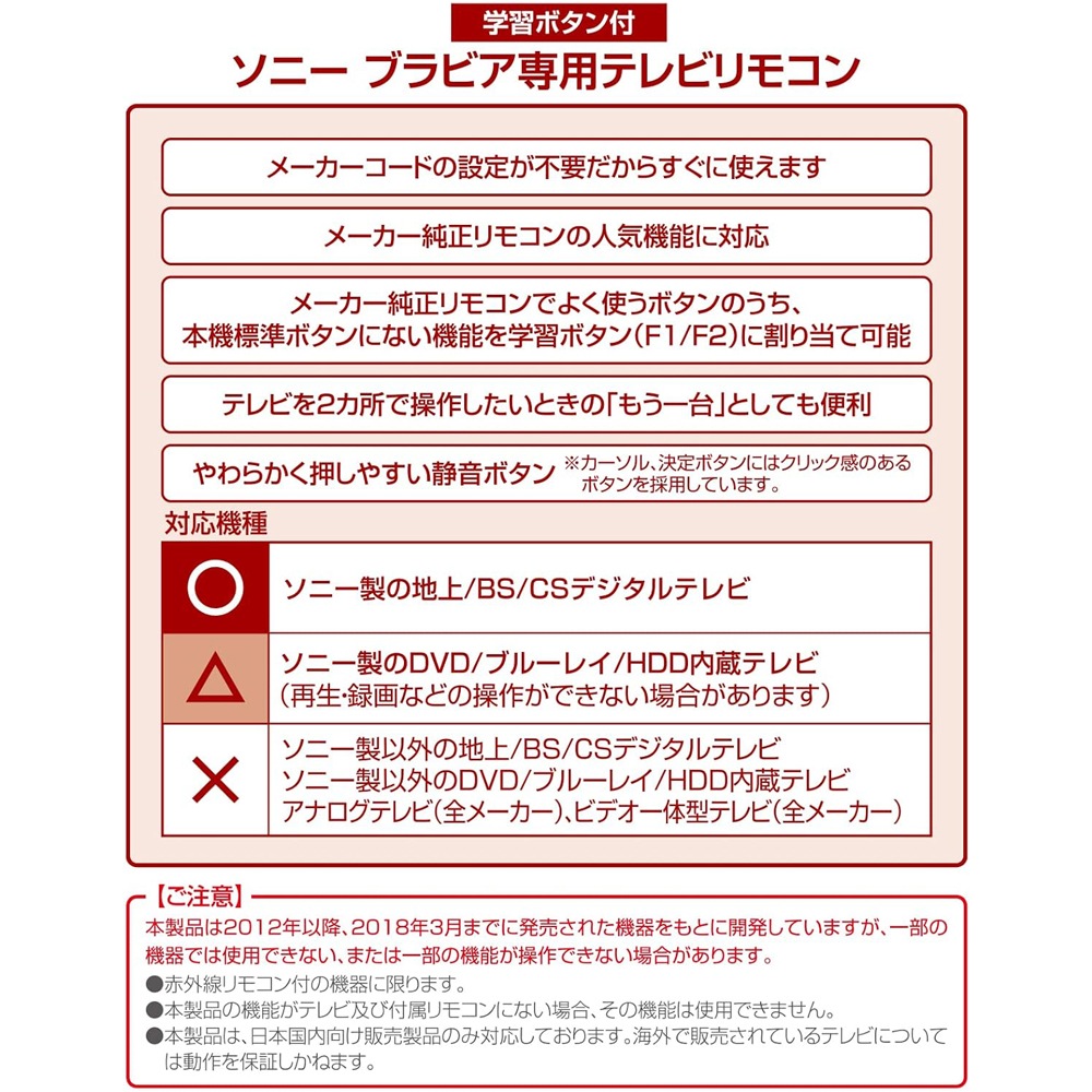 【 Features 】 ● Ready to use immediately and customizable TV remote control dedicated for Sony Bravia ● Pre-set manufacturer code, allows registration of frequently used functions ● Includes 58 main buttons of the genuine remote + 2 buttons for learning registration 【 Specifications 】 ■ Compatible models guideline ○: Sony terrestrial/BS/CS digital TVs △: Sony DVD/Blu-ray/HDD built-in TVs (some operations like playback or recording may not be available) ×: Non-Sony terrestrial/BS/CS digital TVs, non-Sony DVD/Blu-ray/HDD built-in TVs, analog TVs (all manufacturers), video combination TVs (all manufacturers) ■ Operating distance: approx. 7m (varies depending on the device and room conditions) ■ Power source: DC 3V, 2 AAA batteries (sold separately) ■ Battery life: about 1 year (using new alkaline batteries); varies with usage frequency ■ Dimensions: Width 50.5 × Height 210 × Thickness 27.1 mm ■ Weight: approx. 98g (excluding batteries) ■ Included accessories: Warranty card, Instruction manual ■ Memory backup function: Saves settings even when batteries are removed during replacement 【 Notes 】 * This product was developed based on devices released between 2012 and March 2018. Some devices may be incompatible or some functions may not operate. - Works only with devices that have infrared remote controls. - Functions not present on the TV or original remote control cannot be used. - This product supports only devices sold in Japan. Operation cannot be guaranteed for TVs sold overseas. Compatible Models: KJ-24W450E, KJ-49X8000E, KJ-43X8000E, KJ-65X9000E, KJ-55X9000E, KJ-49X9000E, KJ-65X9500E, KJ-55X9500E, KJ-75X8500E, KJ-65X8500E, KJ-55X8500E, KJ-77A1, KJ-65A1, KJ-55A1, KJ-43W730E, KJ-32W730E, KJ-100Z9D, KJ-75Z9D, KJ-65Z9D, KJ-49X7000D, KJ-49X8300D, KJ-43X8300D, KJ-24W450D, KJ-65X9350D, KJ-55X9350D, KJ-65X8500D, KJ-55X8500D, KJ-48W730C, KJ-40W730C, KJ-32W730C, KJ-49X8000C, KJ-32W500C, KJ-65X9000C, KJ-55X9000C, KJ-50W870C, KJ-43W870C, KJ-65X9300C, KJ-55X9300C, KJ-75X9400C, KJ-65X8500C, KJ-55X8500C, KJ-49X8500C, KJ-43X8500C, KJ-48W700C, KJ-40W700C, KJ-32W700C, KDL-55W950B, KDL-24W600A, KDL-42W900B, KD-85X9500B, KD-65X9500B, KD-70X8500B, KD-65X8500B, KD-55X8500B, KD-49X8500B, KDL-60W600B, KDL-48W600B, KDL-40W600B, KD-65X9200B, KD-55X9200B, KDL-32W500A, KDL-50W800B, KDL-42W800B, KDL-32W700B, KDL-55W920A, KDL-46W920A, KDL-40W920A, KD-65X8500A, KD-55X8500A, KDL-40W900A, KD-65X9200A, KDL-47W802A, KD-55X9200A, KDL-42W650A, KDL-55W900A, KDL-32W600A, KDL-46W900A, KDL-55W802A, KDL-42W802A, KD-84X9000, KDL-55HX950, KDL-65HX950, KDL-40EX750, KDL-32HX750, KDL-40HX750, KDL-46HX850, KDL-46HX750, KDL-55HX850, KDL-40HX850, KDL-55HX750, KDL-26EX540, KDL-22EX540, KDL-32EX550