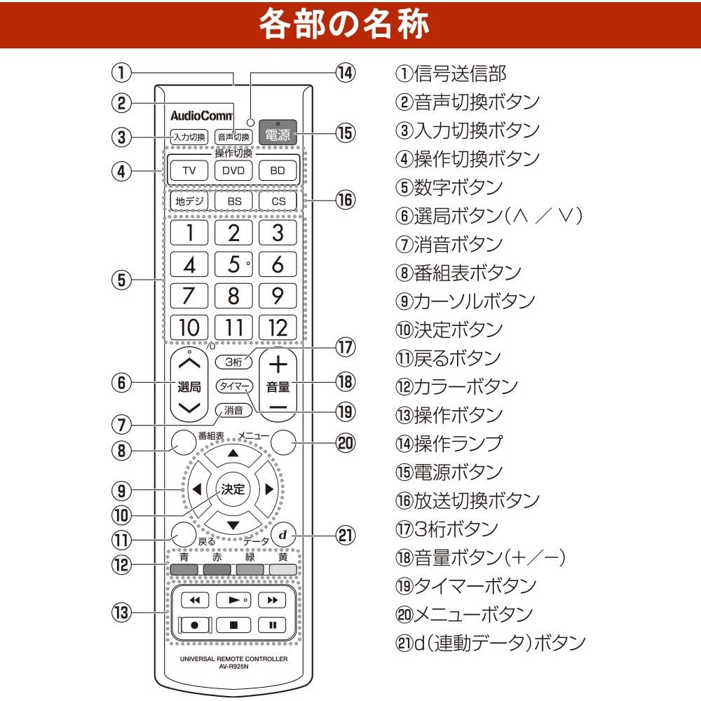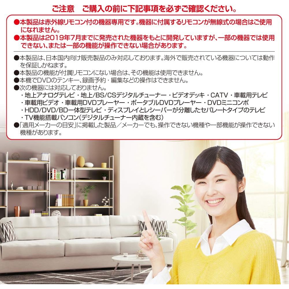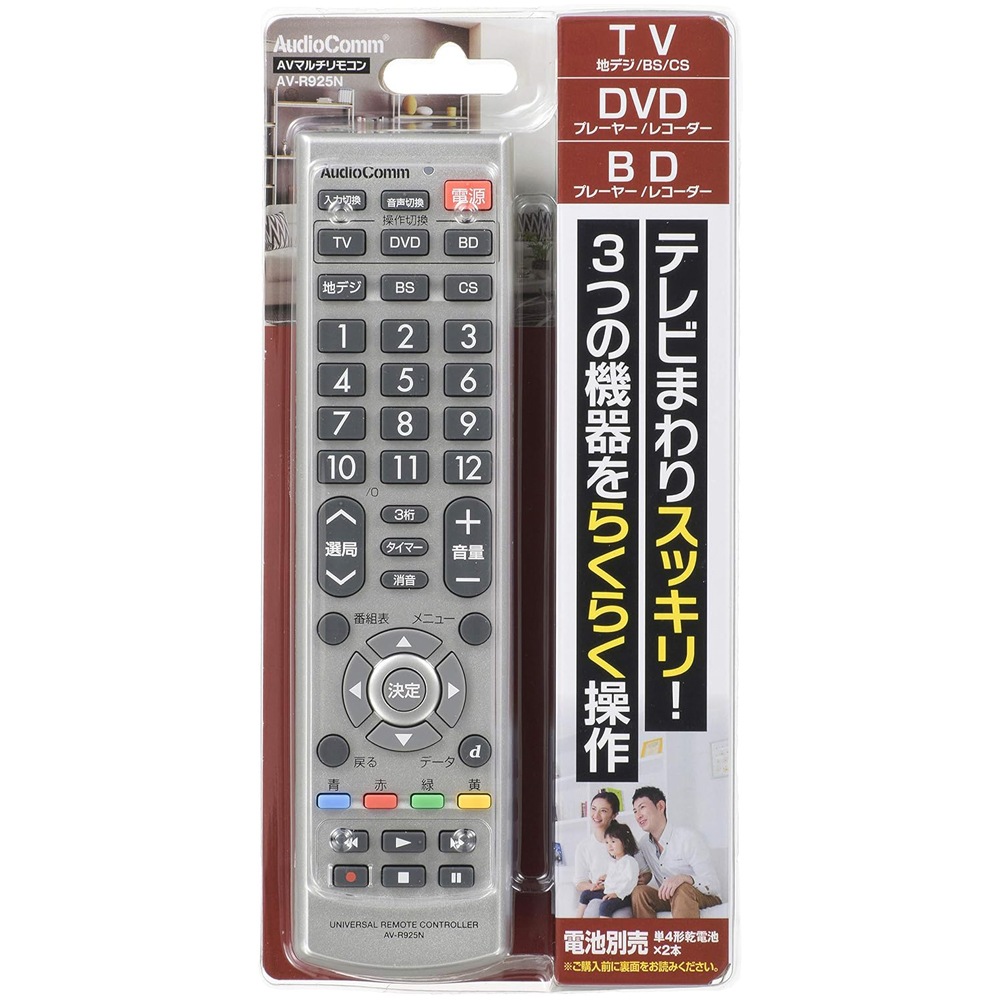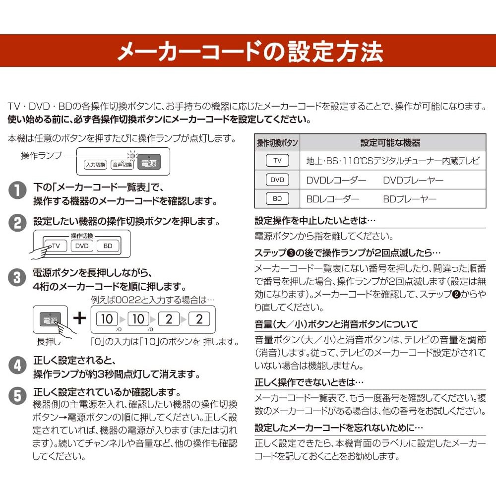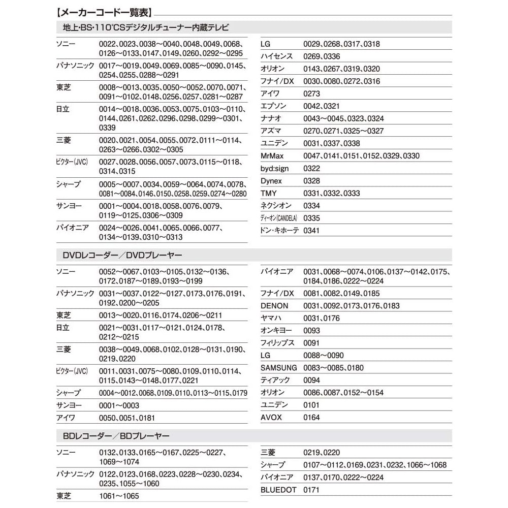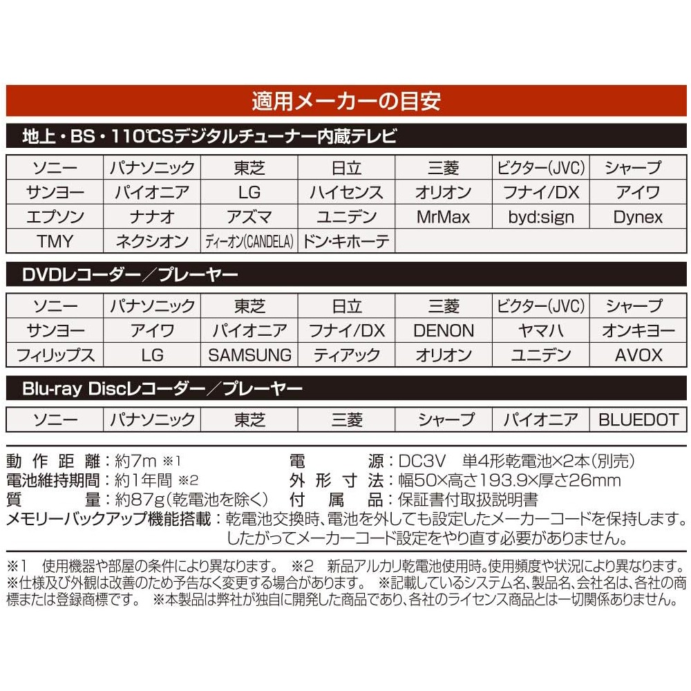 【 Features 】 ● Keep the area around your TV neat. Easily operate three devices with just one remote. ● Can control a total of 3 devices: TV (terrestrial digital/BS/CS), DVD (player/recorder), and BD (player/recorder). ● Works even if the devices are from different manufacturers. ● Equipped with a memory backup function that retains the set manufacturer codes even if the batteries are removed. 【 Specifications 】 ■ Operating distance: Approximately 7 meters (may vary depending on the device and room conditions) ■ Power supply: DC 3V, two AAA batteries (sold separately) ■ Battery life: About 1 year (using new alkaline batteries; varies depending on usage and conditions) ■ Dimensions: W 50 × H 193.9 × D 26 mm ■ Weight: Approximately 87g (excluding batteries) ■ Included accessories: Instruction manual with warranty ■ Applicable manufacturers (guideline): ・TVs with built-in terrestrial, BS, and 110°CS digital tuners Sony, Panasonic, Toshiba, Hitachi, Mitsubishi, Victor (JVC), Sharp, Sanyo, Pioneer, LG, Hisense, Orion, Funai/DX, Aiwa, Epson, Eizo, Azuma, Uniden, MrMax, byd:sign, Dynex, TMY, Nexion, Dyon (CANDELA), Don Quijote ・DVD recorders/players Sony, Panasonic, Toshiba, Hitachi, Mitsubishi, Victor (JVC), Sharp, Sanyo, Aiwa, Pioneer, Funai/DX, DENON, Yamaha, Onkyo, Philips, LG, Samsung, TEAC, Orion, Uniden, AVOX ・Blu-ray Disc recorders/players Sony, Panasonic, Toshiba, Mitsubishi, Sharp, Pioneer, BLUEDOT ≪ Notes ≫ * This product is designed for devices with infrared remote controls. It cannot be used with devices that use wireless (radio frequency) remotes. * This product was developed based on devices released up until July 2019; some devices may not be compatible or some functions may not operate properly. * This product is only compatible with products sold in Japan. Operation with devices sold overseas is not guaranteed. * Functions not included on the original remote control cannot be used with this product. * Numeric keypad for DVD, recording reservation, editing, and similar functions cannot be performed with this remote. * The following devices are not supported: ・Analog terrestrial TVs, terrestrial/BS/CS digital tuners, VCRs, CATV, vehicle-mounted TVs ・Vehicle-mounted video players, vehicle-mounted DVD players, portable DVD players, DVD mini-compo systems ・TVs with built-in HDD/DVD/BD recorders ・Separate type TVs where the display and receiver are detached ・Computers with TV functions (including those with built-in digital tuners) * Even among the listed applicable manufacturers/products, some models may not operate or some functions may not be available.