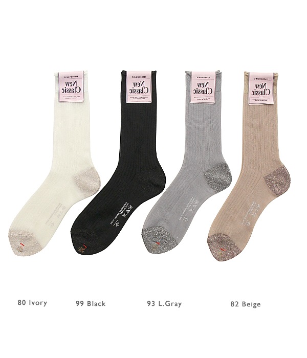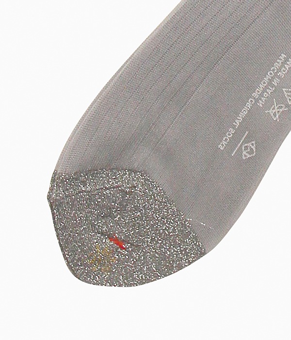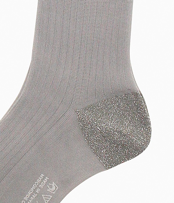 A pair of ribbed socks with a transparent base and glitter accents at the toes and heels. When paired with sandals or mule-type shoes, the glitter adds a cute point of interest.| Materials | 58% Polyester / 42% Nylon |