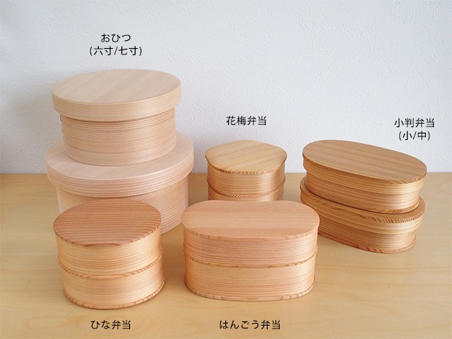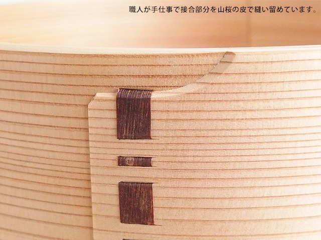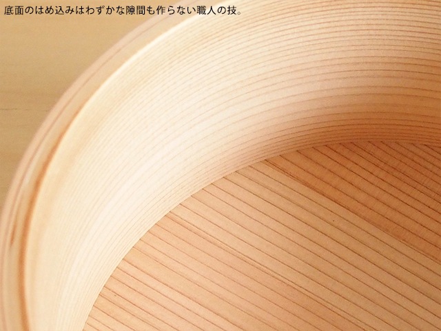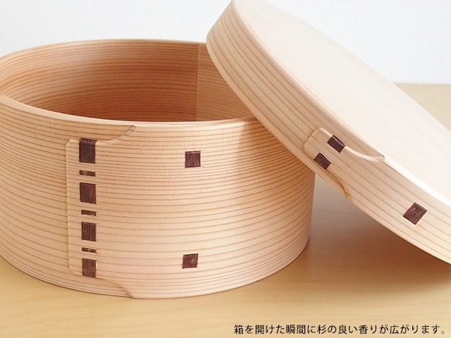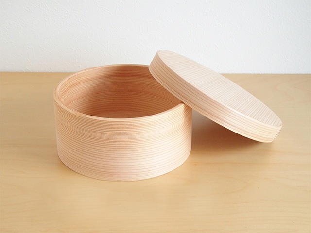 A beautiful bentwood container made from Akita cedar with a uniform wood grain.