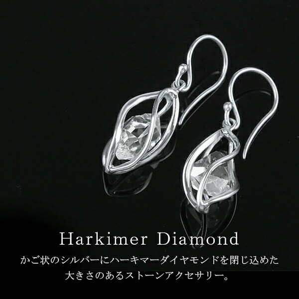 These are natural stone earrings featuring a cage-shaped silver setting enclosing Herkimer Diamonds.
