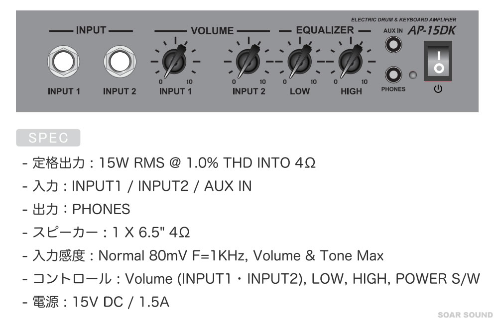 Controls: Volume (INPUT1・INPUT2), LOW, HIGH, POWER S/W