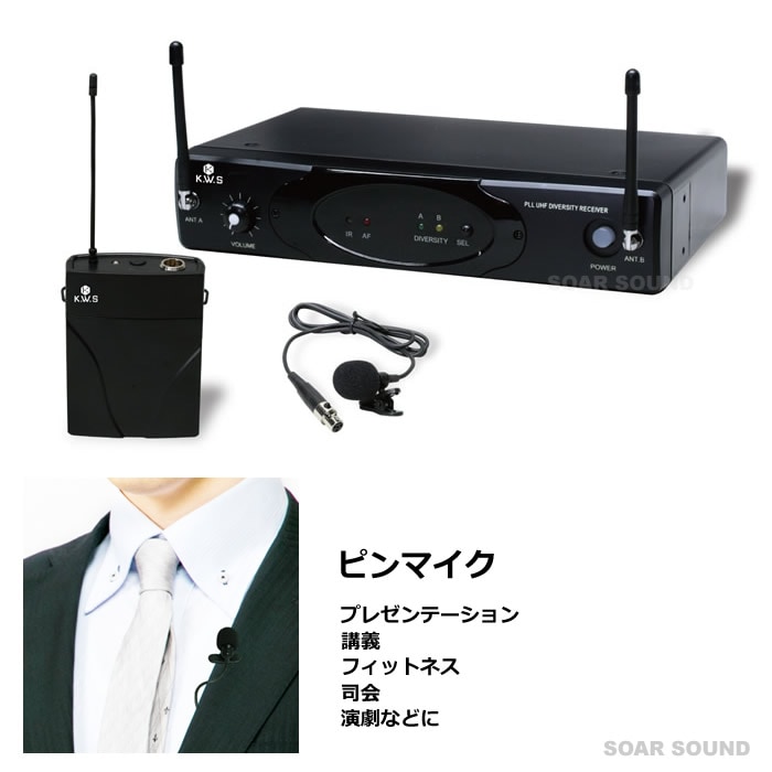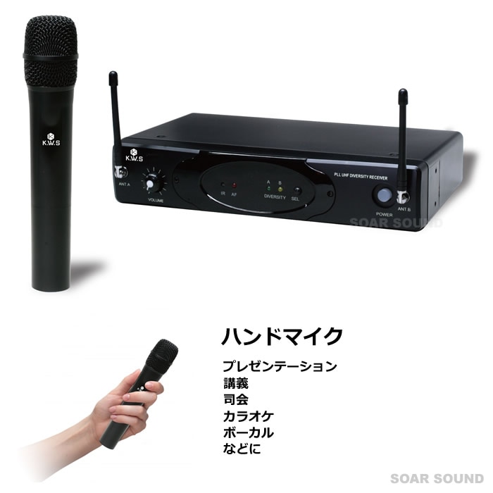 An optimal wireless microphone set for use in a simple setup. ------------------------------------- Four microphone types are available—please choose one. **[Handheld Microphone Type Set]** Convenient and easy to use for karaoke, band vocals, presentations, lectures, emceeing, and more. **[Lavalier Microphone (Clip-on) Type Set]** A set consisting of one wireless transmitter, a dedicated clip-on (lavalier) microphone, and a receiver. Allows hands-free use, making it convenient and easy for presentations, lectures, fitness, emceeing, etc. **[Headset Microphone Type Set]** Designed to stay in place even during vigorous movement while keeping both hands free, making it convenient and easy for drum vocals, presentations, fitness, emceeing, and more. ------------------------------------- This is a set of one wireless microphone and one receiver. Since it is a one-to-one configuration (one receiver per one wireless mic), it is recommended for simple situations where you use 1–3 wireless microphones. It offers sufficient functionality, including a maximum usable distance of 90 m (see note), true diversity with two antennas to improve reception and reduce dropouts, and an auto-mute function when the signal is interrupted. You can select one channel from a total of 30 channels, and setup is easy via infrared (IR) communication. The front of the receiver includes an IR port for setup, various buttons, a display, and a knob—allowing you to perform almost all settings from the receiver’s front panel. On the rear, the receiver provides one balanced XLR output and one unbalanced 1/4" phone output, making it a professional-level wireless system. *(Note) Range varies depending on the usage environment.* ------------------------------------- ## Key Features - Pro-level wireless system ideal not only for live performances but also for presentations, educational settings, fitness, DJs, karaoke, etc. - Equipped with UHF band channels (license-free “B band”) to reduce interference in the same location and maximize the number of wireless systems that can be used. - The receiver can be used as a standalone unit or mounted in a standard 19-inch rack (2-way type). - Automatic mute function: automatically cuts audio when the signal can no longer be received. - Usable up to 300 feet (approx. 90 m) (line-of-sight, under optimal conditions). - The microphone uses standard AA batteries. Continuous operation lasts about 3 hours (with alkaline batteries). *Battery life varies depending on conditions.* - Up to 6 units (systems) can be used simultaneously (under optimal conditions while meeting basic requirements). ------------------------------------- ## Package Contents - KWS-899R receiver - Power adapter - 1/4-inch audio cable (1.5 m) - Rack mount ears - Japanese instruction manual / product warranty - Microphone (one of: handheld, clip-on/lavalier, headset, or guitar use) *Included batteries are for testing purposes only.*